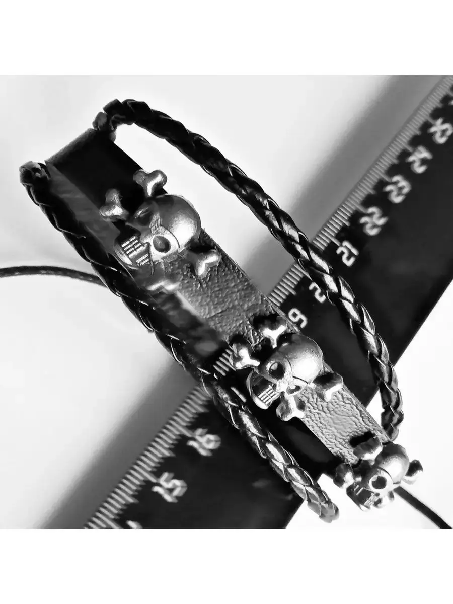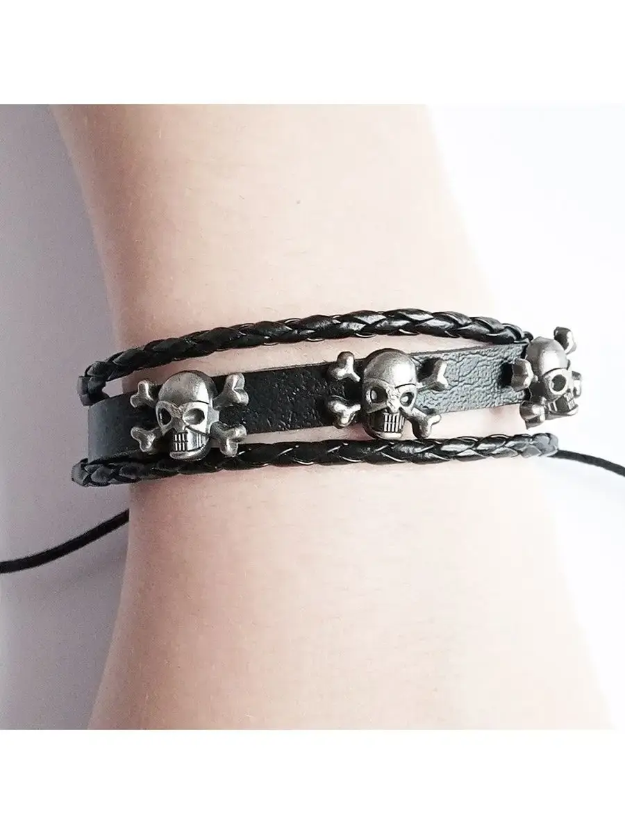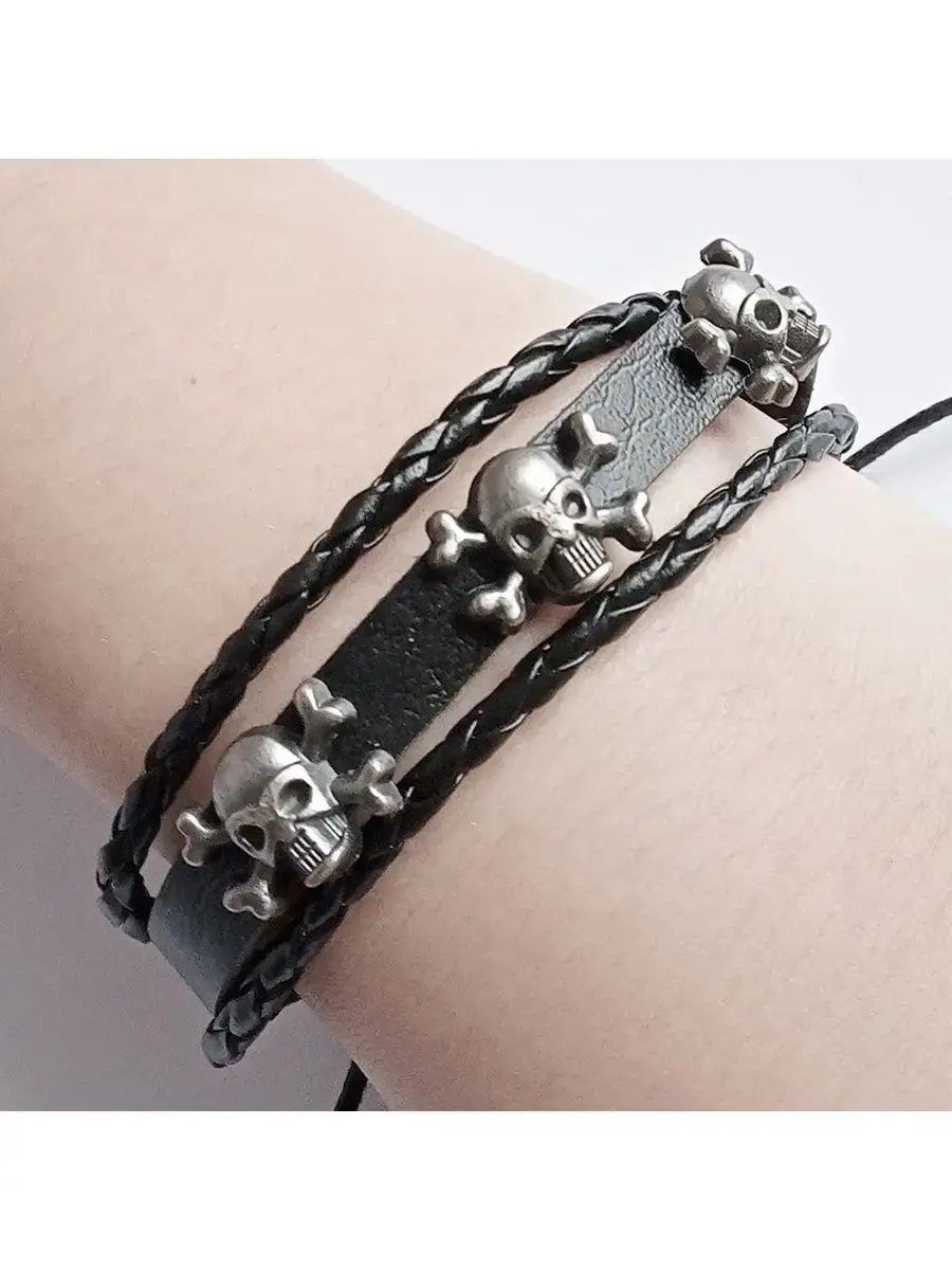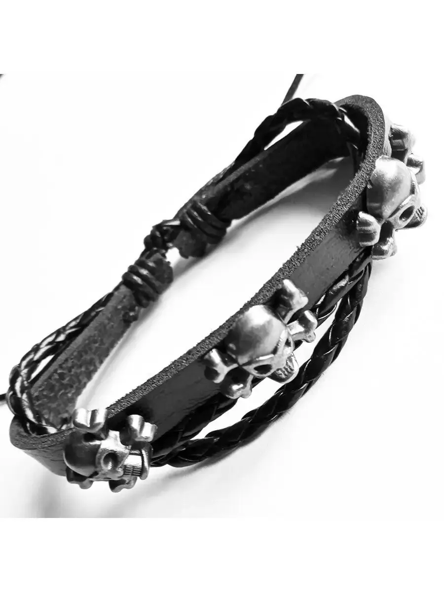 Кожаный браслет фенечка "Черепа-3".Материал: натуральная кожа, череп: металл.Браслет из кожи является уникальным украшением, которое пришло к нам с давнимвремен. Раньше эти аксессуары символизировали высокий статус владельца и его власть в древнем мире. В последующем это изделие превратилось в популярное украшением, которое позволяет дополнить образ и сделать его более гармоничным и интересным. Кроме того, стильный кожаный браслет может служить признаком принадлежности к какой-либо из современных субкультур или же простоподчеркиватьуникальность владельца. Кожаные браслеты последние несколько десятилетий являются незаменимыми аксессуарами как у девушек, так и у парней. Удивительно, но они смотрятся органично и под деловой костюм на переговорах, и под порванные джинсы и футболку на рок концерте. Готовясь к важному событию в жизни, будь то важная деловая встреча или просто сдача экзамена, любой будет чувствовать себя намного увереннее, зная, что его образ безупречен и дополнен такой маленькой деталью, которая, к тому же, может служить ещё и символом на удачу.