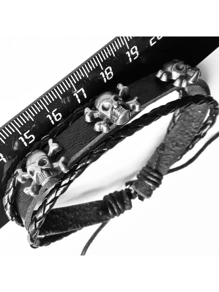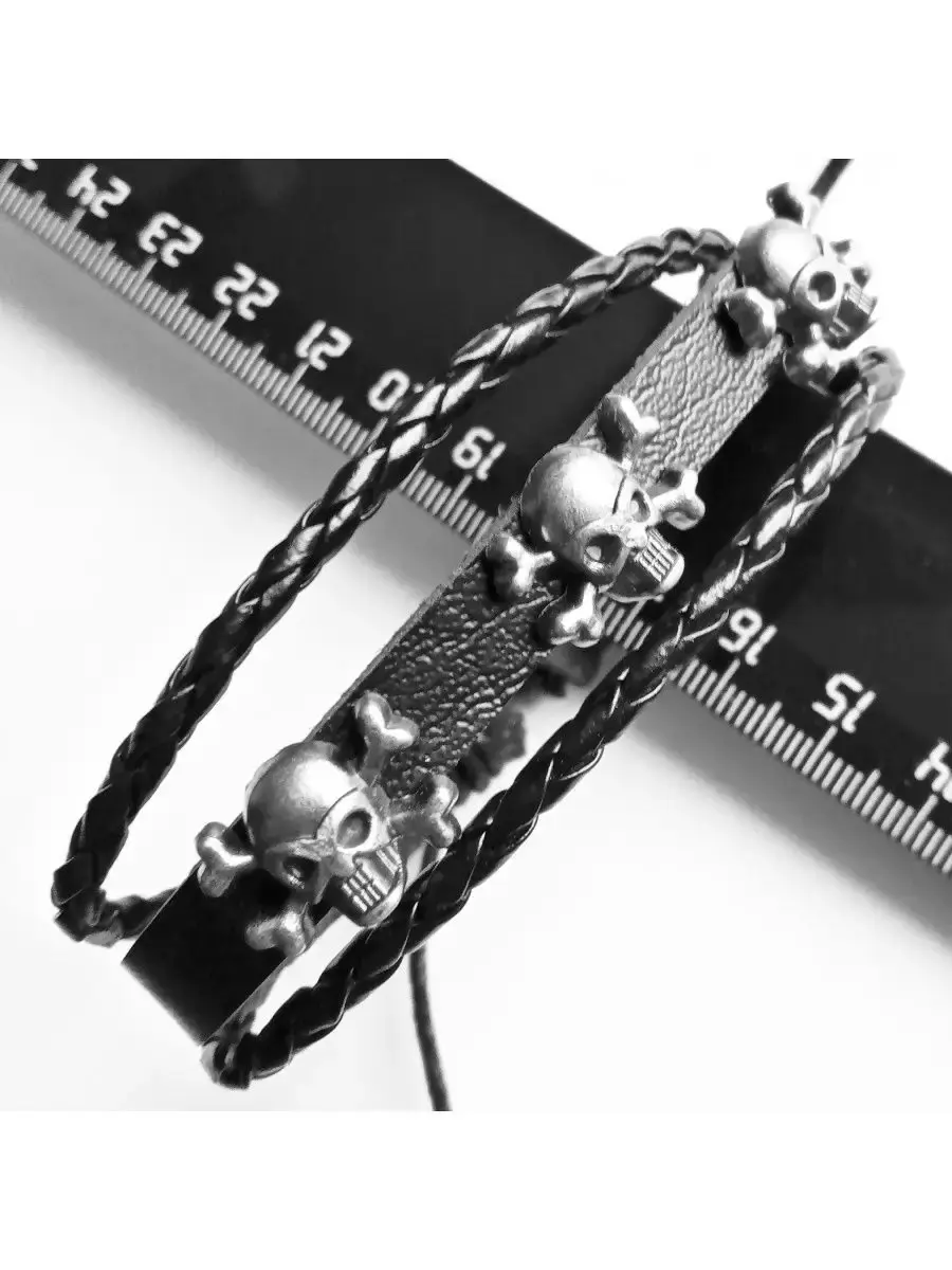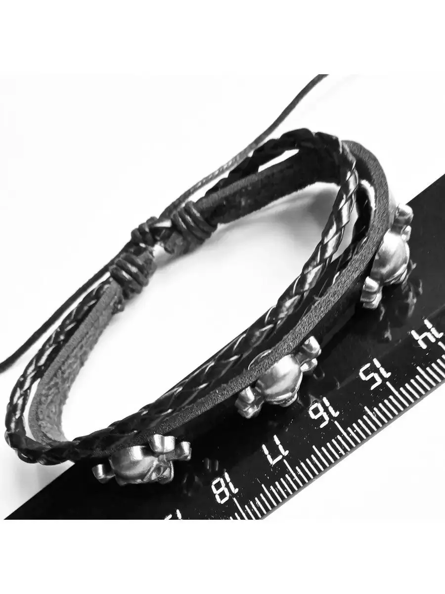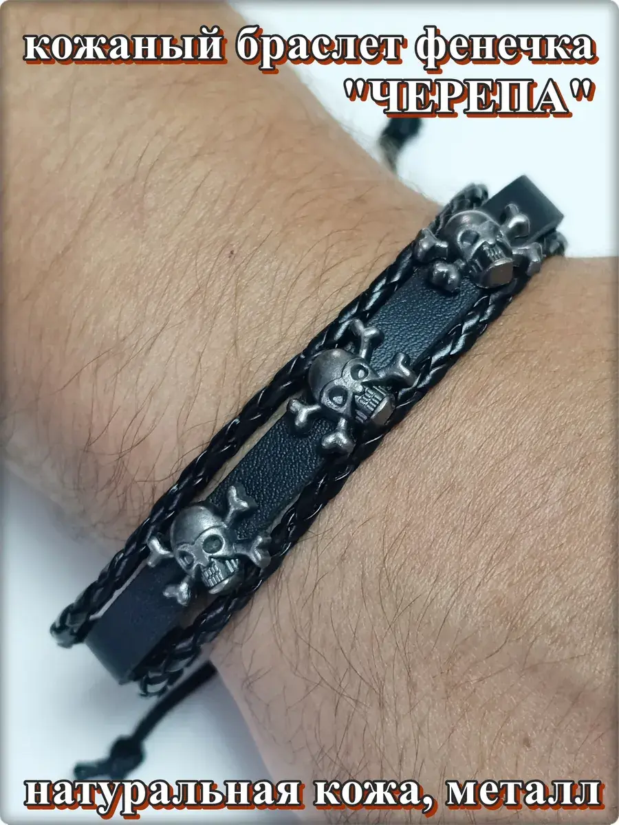 Кожаный браслет фенечка "Черепа-3".Материал: натуральная кожа, череп: металл.Браслет из кожи является уникальным украшением, которое пришло к нам с давнимвремен. Раньше эти аксессуары символизировали высокий статус владельца и его власть в древнем мире. В последующем это изделие превратилось в популярное украшением, которое позволяет дополнить образ и сделать его более гармоничным и интересным. Кроме того, стильный кожаный браслет может служить признаком принадлежности к какой-либо из современных субкультур или же простоподчеркиватьуникальность владельца. Кожаные браслеты последние несколько десятилетий являются незаменимыми аксессуарами как у девушек, так и у парней. Удивительно, но они смотрятся органично и под деловой костюм на переговорах, и под порванные джинсы и футболку на рок концерте. Готовясь к важному событию в жизни, будь то важная деловая встреча или просто сдача экзамена, любой будет чувствовать себя намного увереннее, зная, что его образ безупречен и дополнен такой маленькой деталью, которая, к тому же, может служить ещё и символом на удачу.