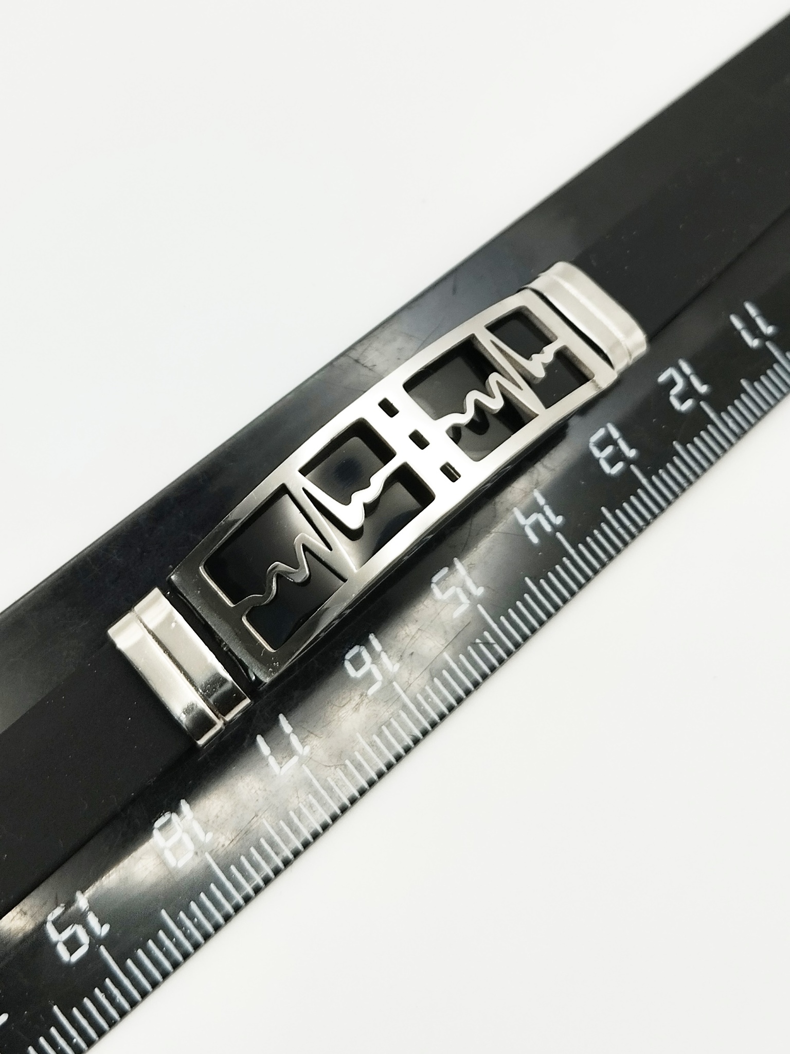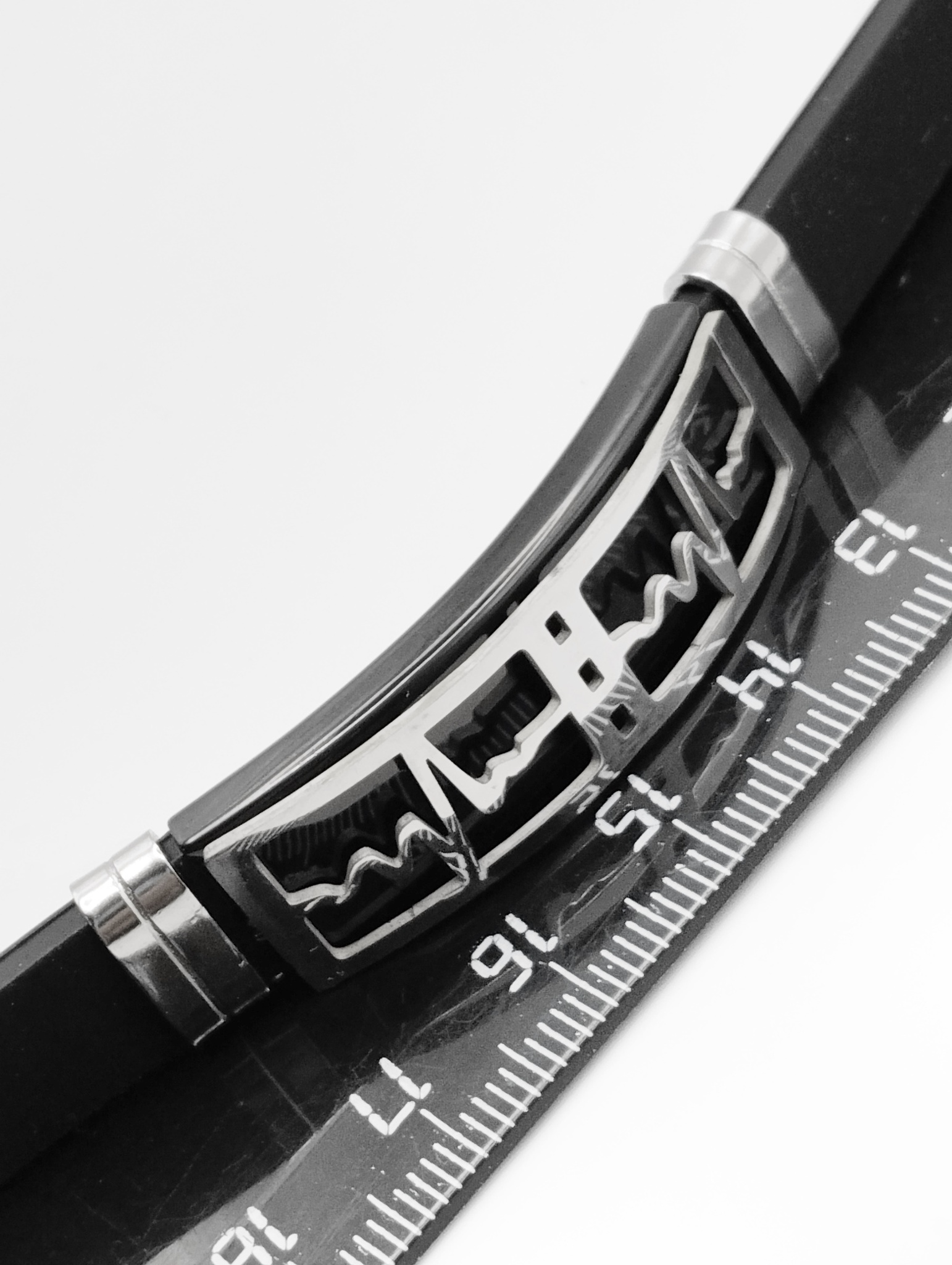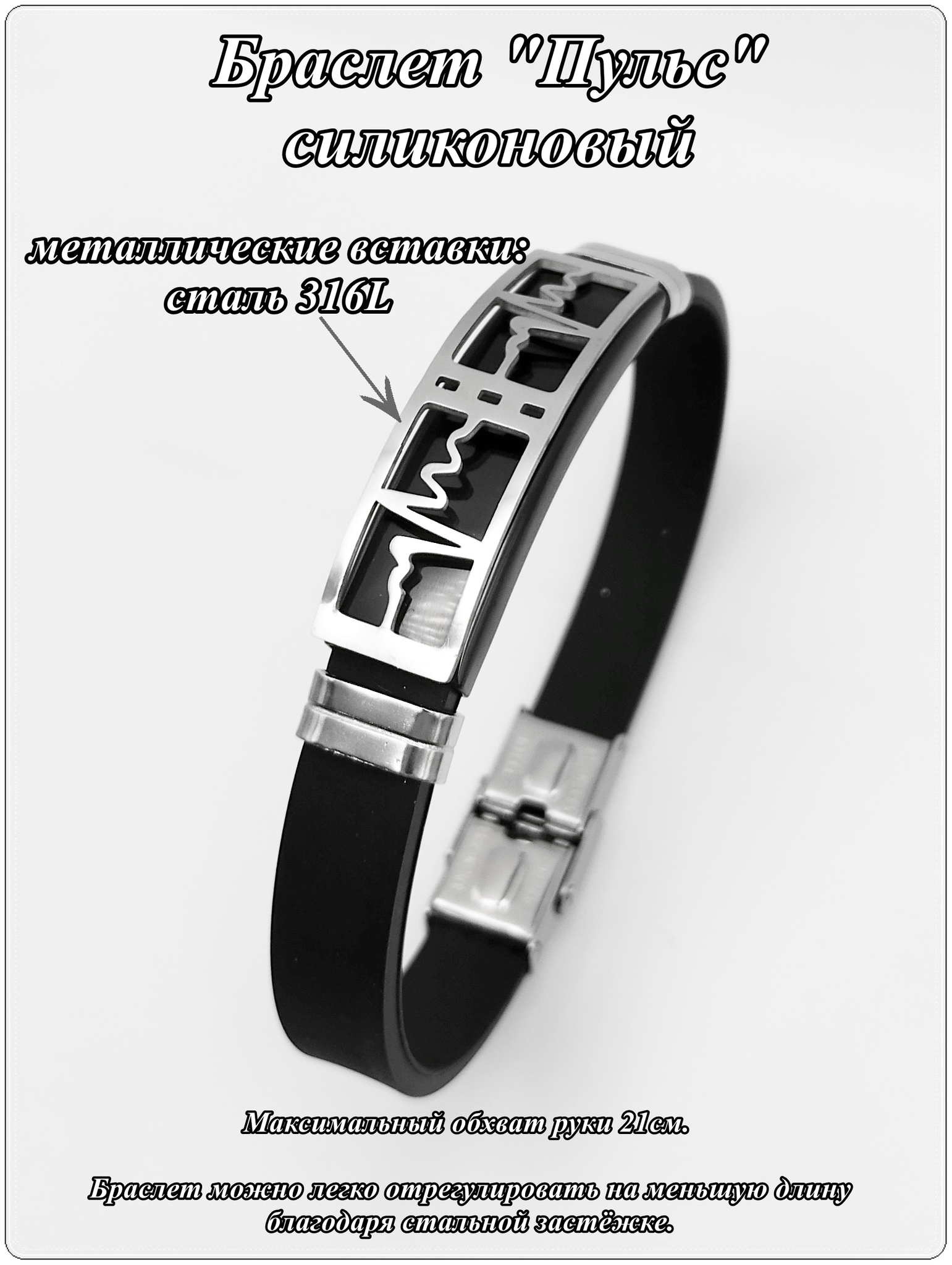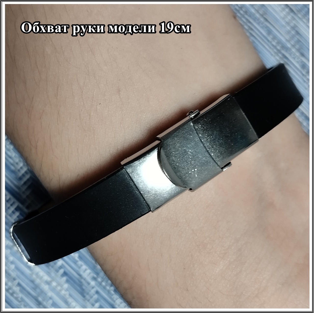 Материал: силикон, толщина 3мм, ширина 10мм. Вставки: сталь 316L. Общая длина браслета 22см. Максимальный обхват руки 21см.