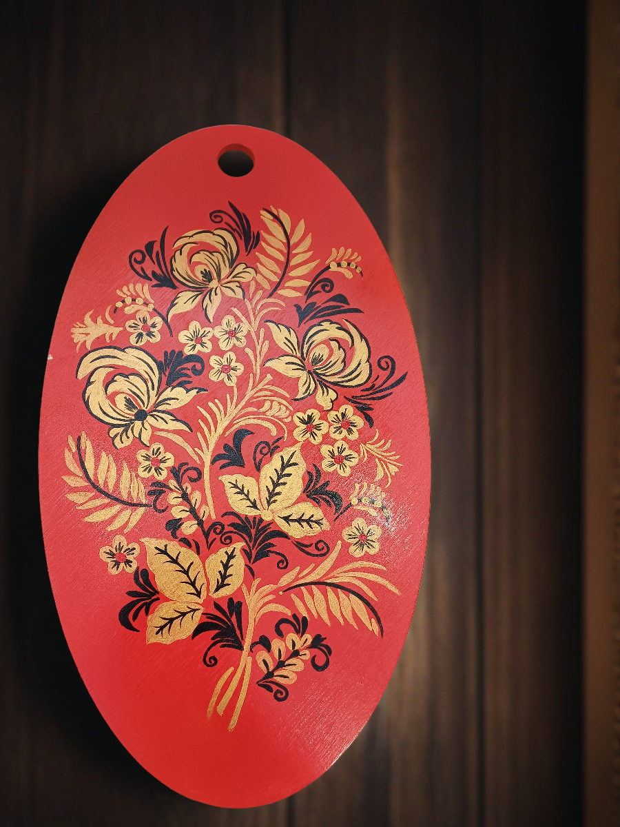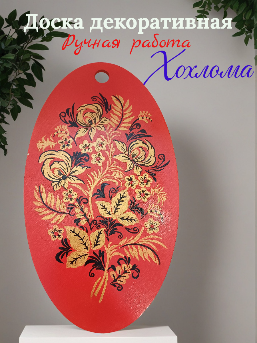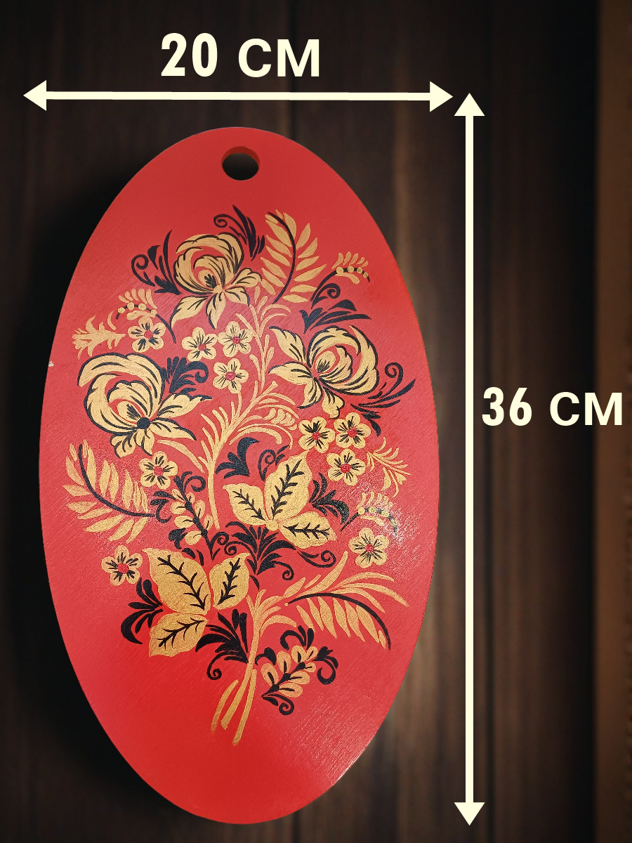 Декоративная разделочная доска с ручной росписью Хохлома. Ширина 20 см, длина 36 см. Все доски расписаны художником вручную, некоторые элементы могут немного отличаться от фото. Ручная работа выполнена акриловыми красками и покрыта лаком. Мы не рекомендуем мыть в посудомоечной машине или горячей водой. Можно использовать как элементы декора кухни в традиционном народном стиле. Этнические декоративные доски подчеркнут так же и классический интерьер и будут оригинальным ярким акцентом вашей кухни или гостинной.