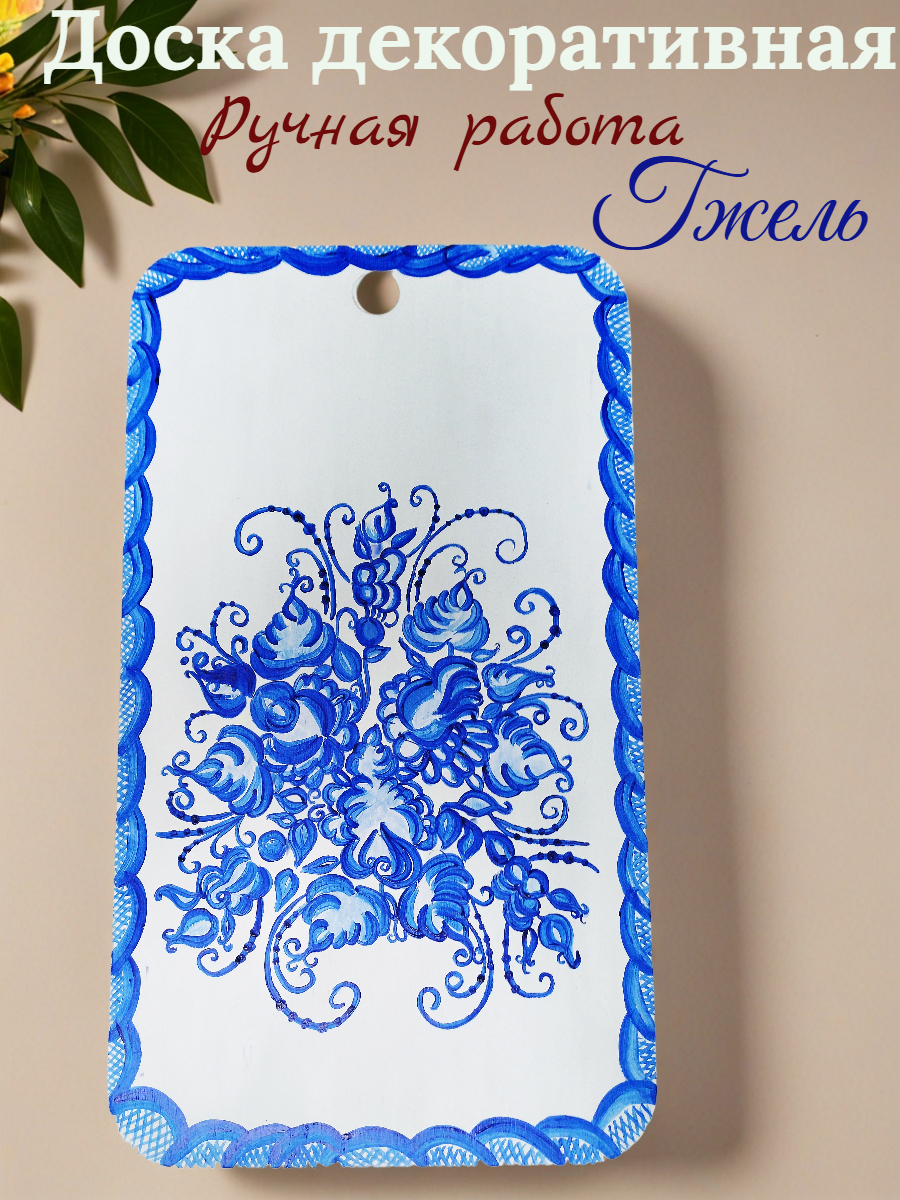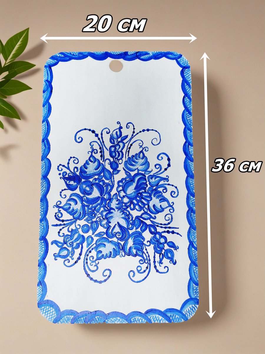 Декоративная разделочная доска с ручной росписью Гжель. Ширина 20 см, длина 36 см. Она станет прекрасным акцентом интерьера и функциональным элементом кухонного пространства. Ручная работа гарантирует уникальность изделия, подчеркнет вашу индивидуальность и создаст атмосферу тепла и комфорта. Для сохранения красоты изделий ручной работы рекомендуем деликатный уход: исключительно ручная чистка холодной водой, нельзя использовать в посудомоечной машине.