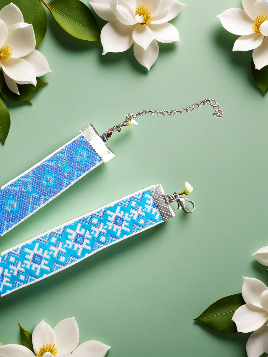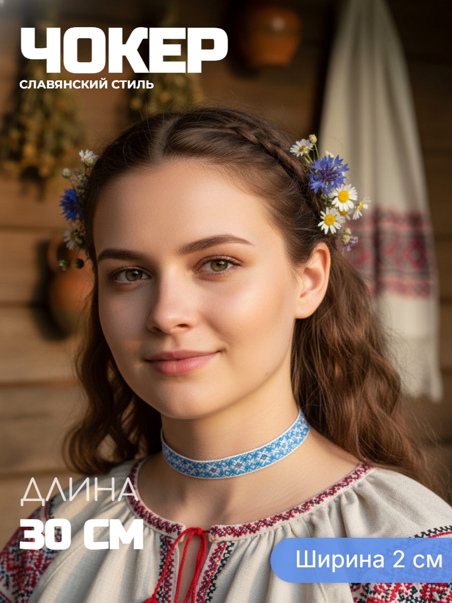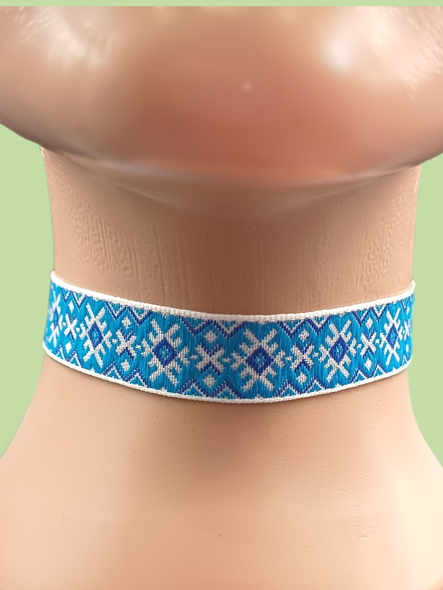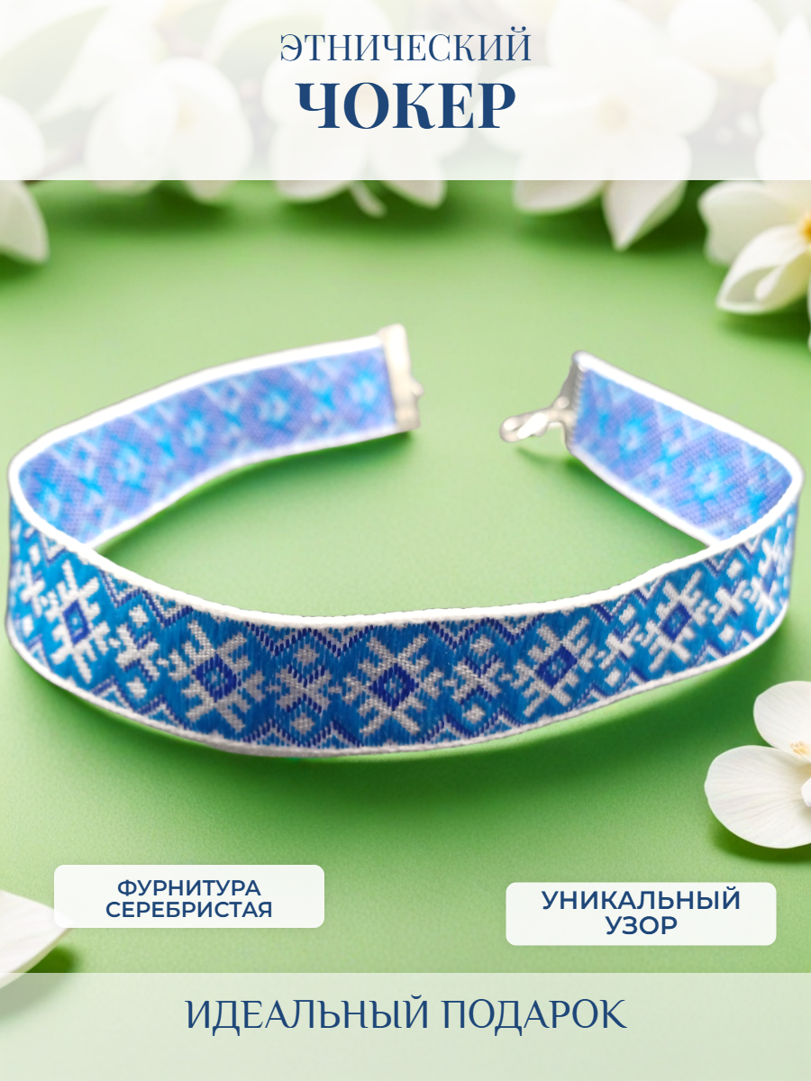 Жаккардовый чокер без подвески с этническим орнаментом. Ширина 2 см Качественное, модное украшение на шею. Длина украшения 30+7 см, ширина 2 см Застежка - карабин серебристого цвета.