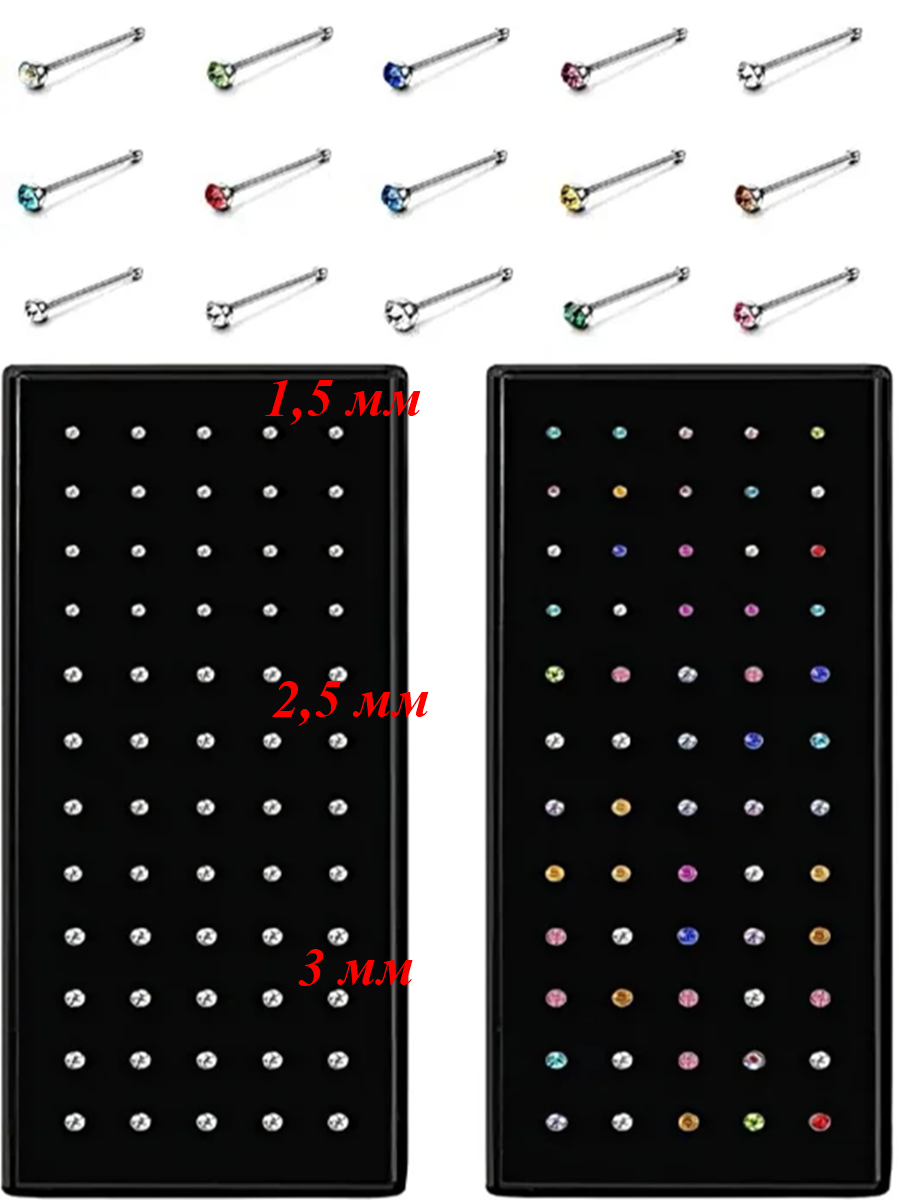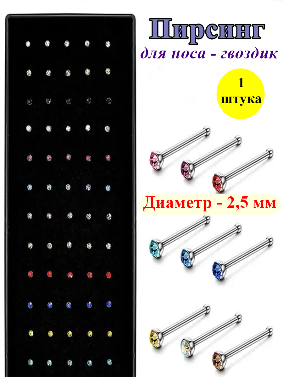 Гвоздики для пирсинга носа. Назначение: для пирсинга носа. Материал: медицинская сталь Длина 8 мм, толщина 0,8 мм, диаметр кристалла 2,5 мм.