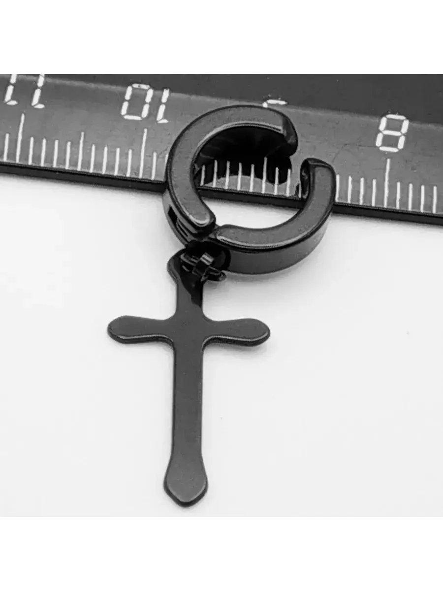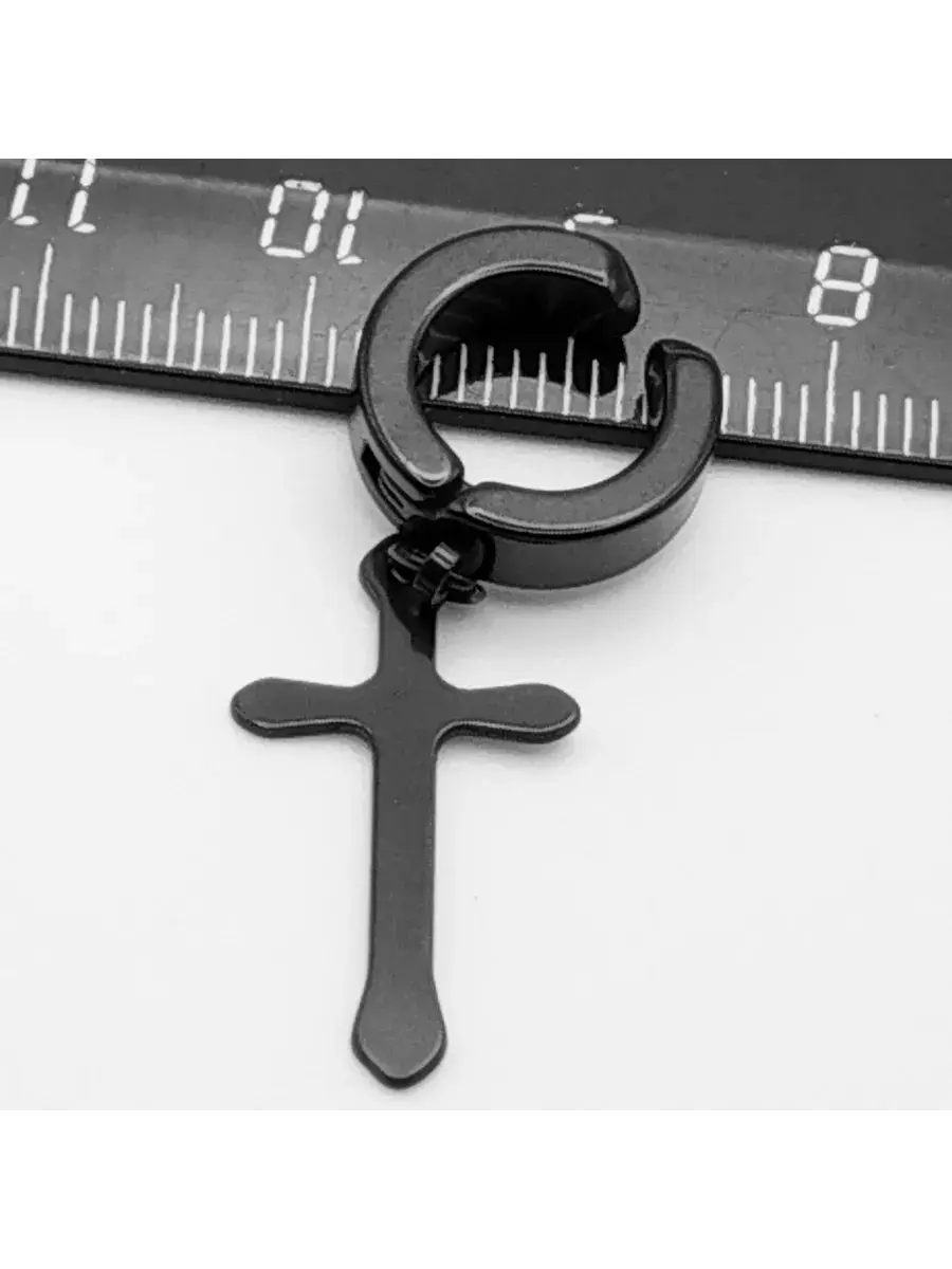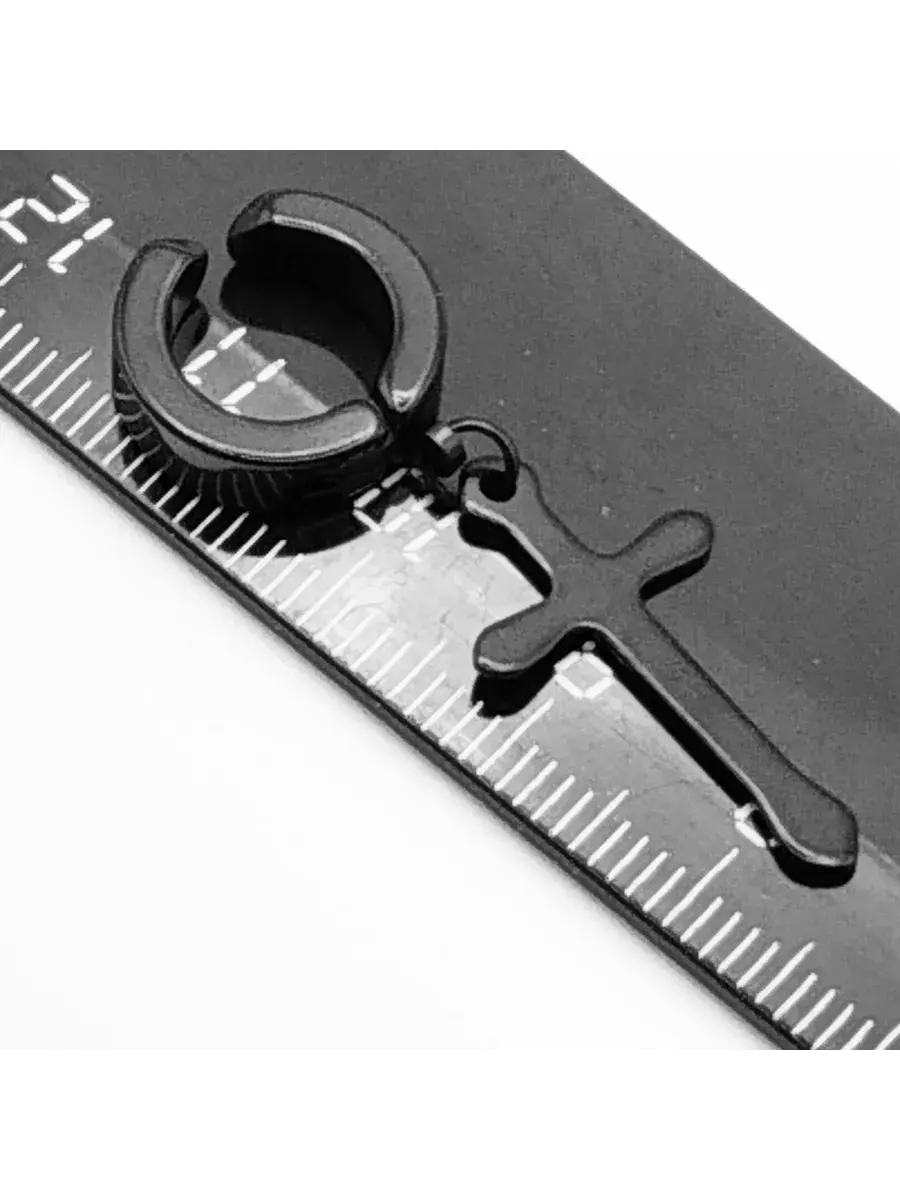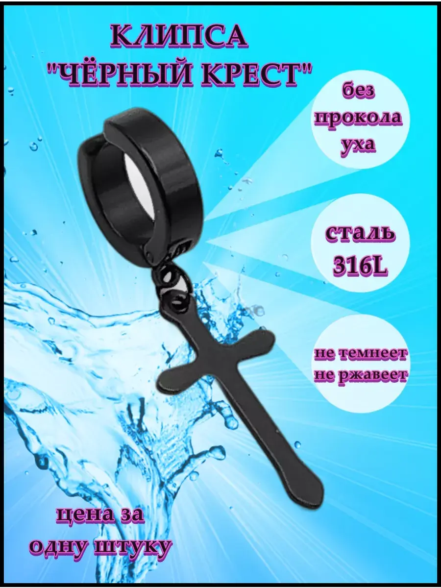 Клипса "Чёрный крест". Цена за штуку!!! Назначение: для имитации прокола и украшения уха без прокола. Материал клипсы: медицинская сталь, титановое покрытие. Диаметр серьги 12 мм, ширина 4 мм. Крест 24х12мм. Важное преимущество украшений из стали заключается в том, что они прослужат очень долго. Материал не тускнеет и не ржавеет, он также не боится контакта с влагой, поэтому в украшениях можно даже принимать ванную.Стоит отметить и то, что украшения из этого сплава подходят даже людям, которые склонны к аллергическим реакциям. В составе нет никеля. Именно он вызывает раздражение на коже.