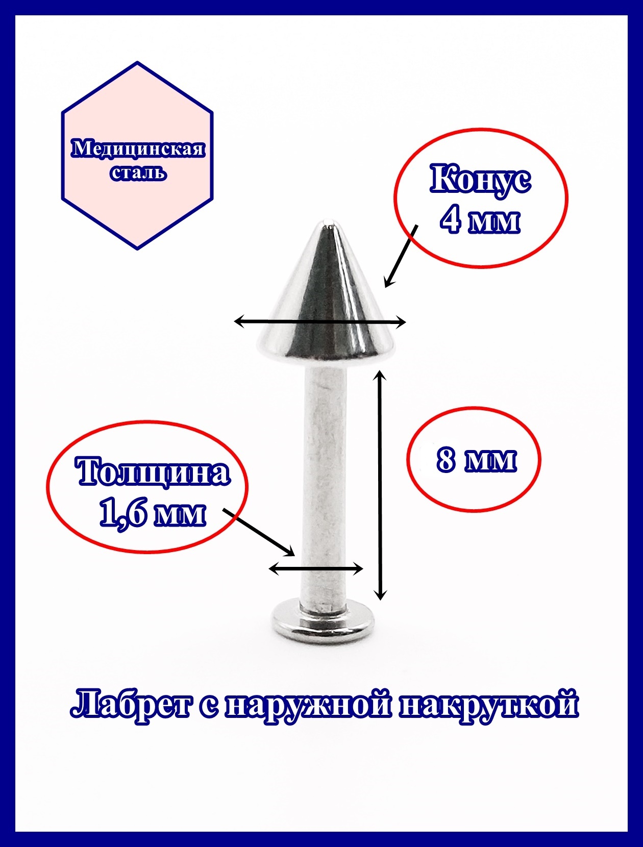 Лабрета для украшения пирсинга губы (идеально подходит для первичного прокола) из медицинской стали (316L)