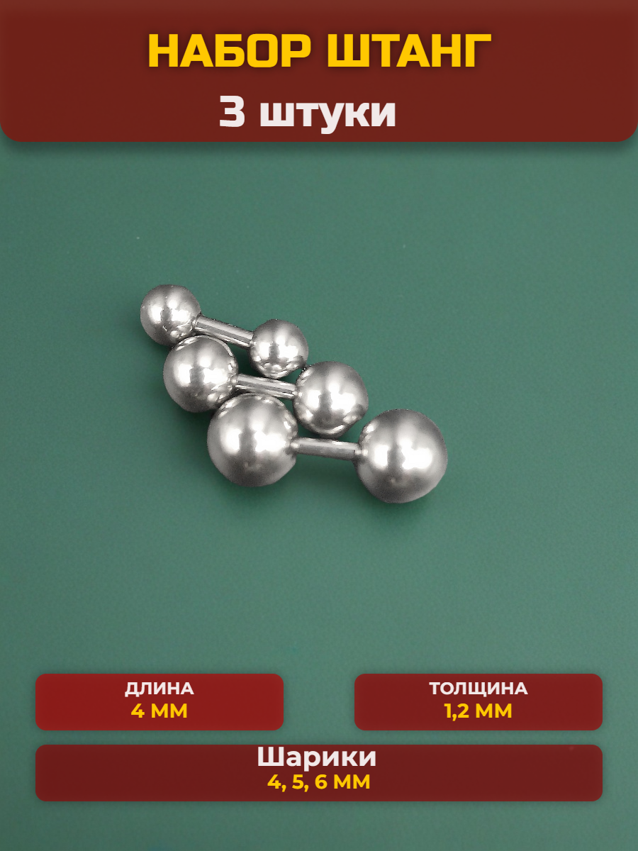 Длина штанги 4 мм, толщина 1,2 мм. Диаметр шариков 4, 5 и 6 мм.