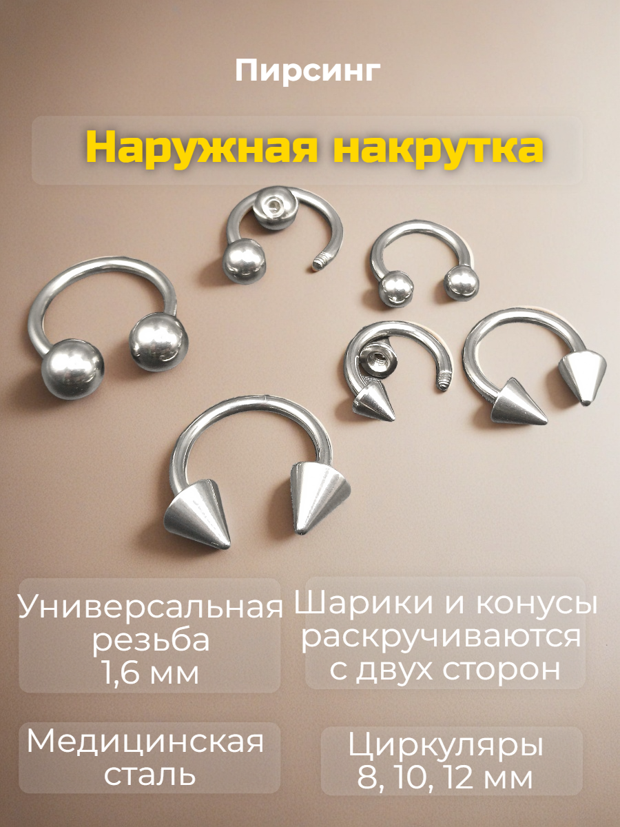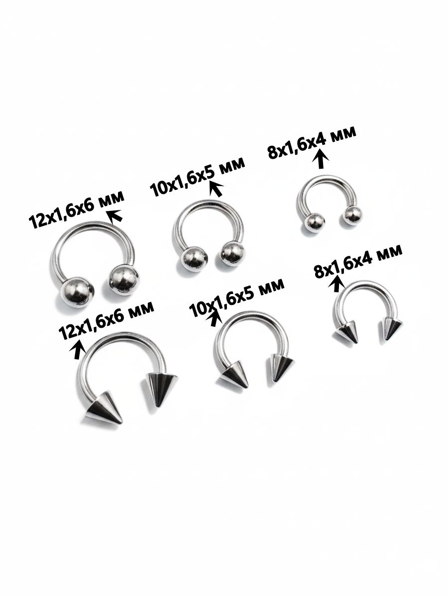 8,10,12 мм с конусами и шариками 4, 5,6 мм для пирсинга.