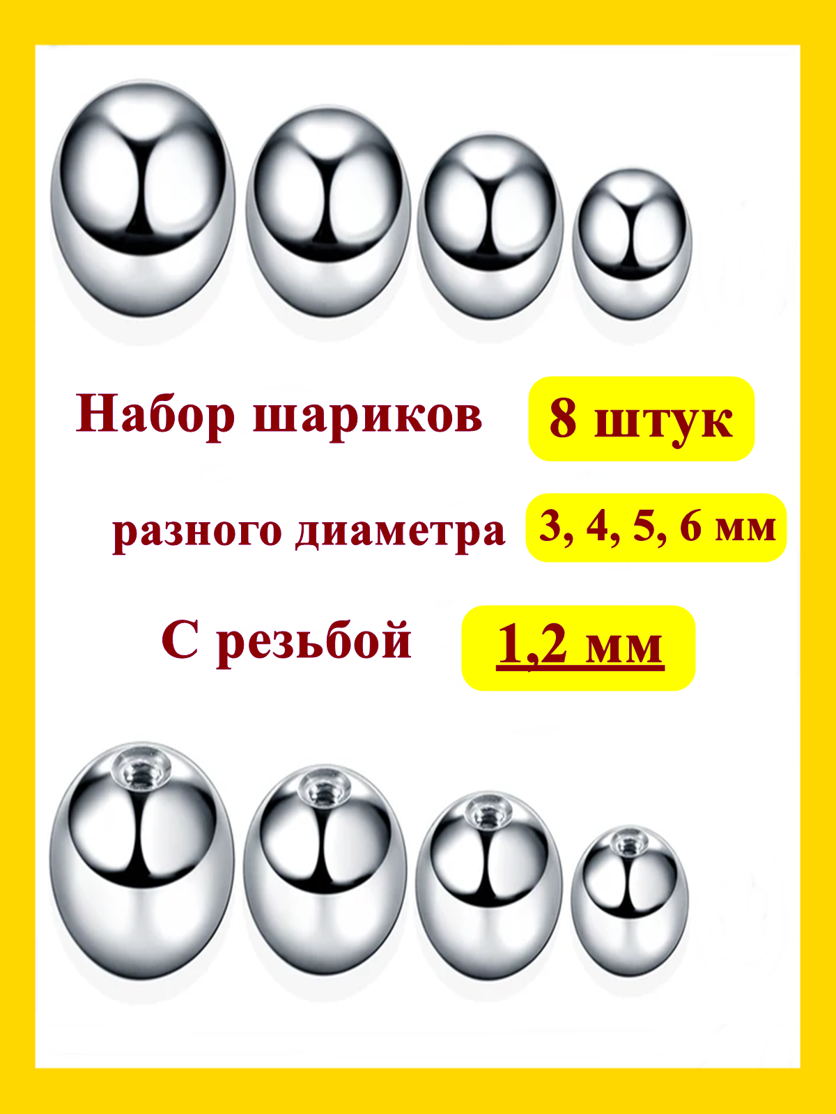Набор шариков для пирсинга из медицинской стали. Резьба шариков 1,2 мм. В набор входят: 2 шарика 3 мм, 2 шарика 4 мм, 2 шарика 5 мм и 2 шарика 6 мм