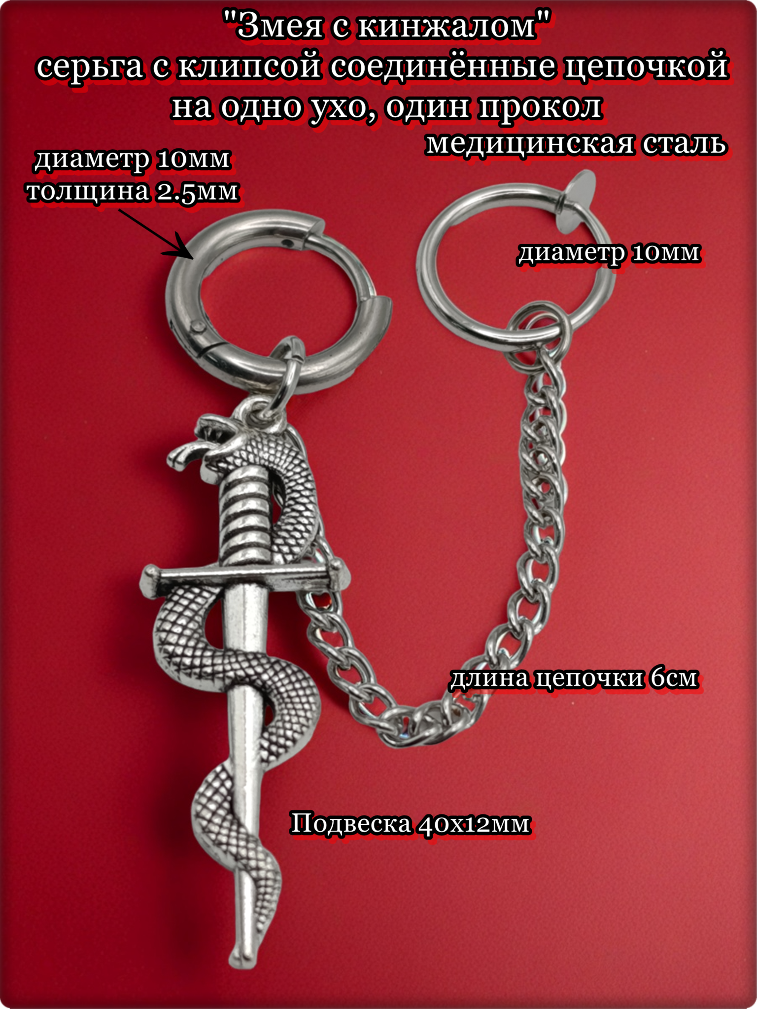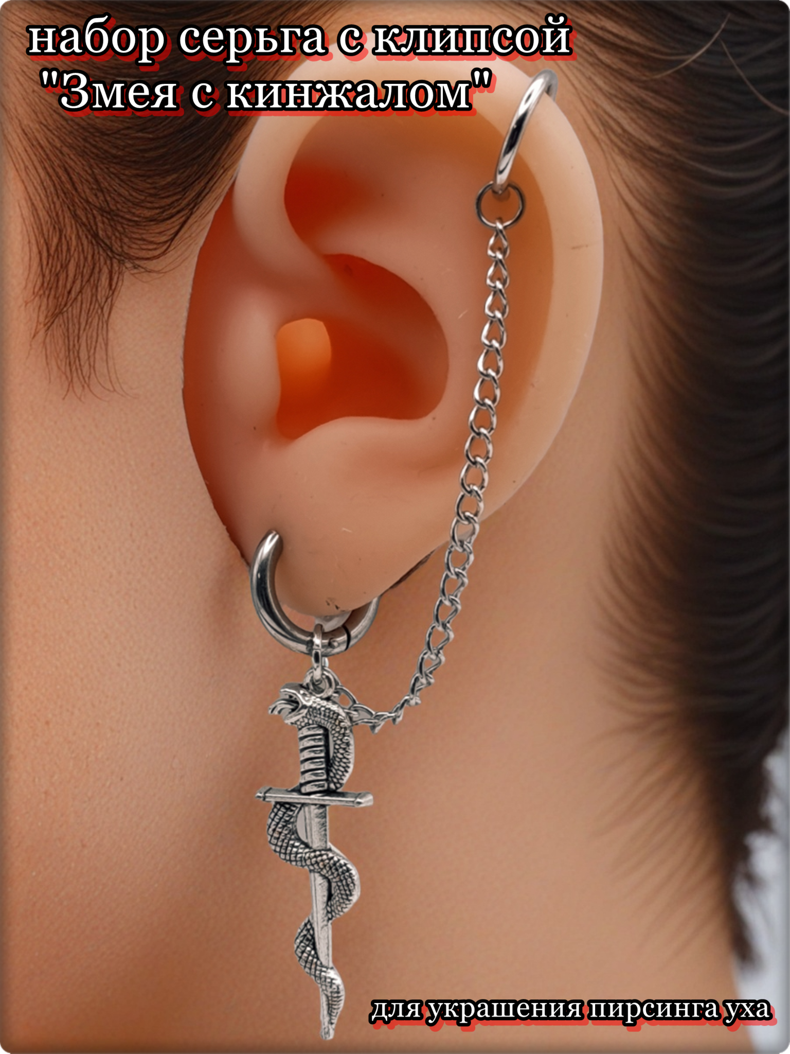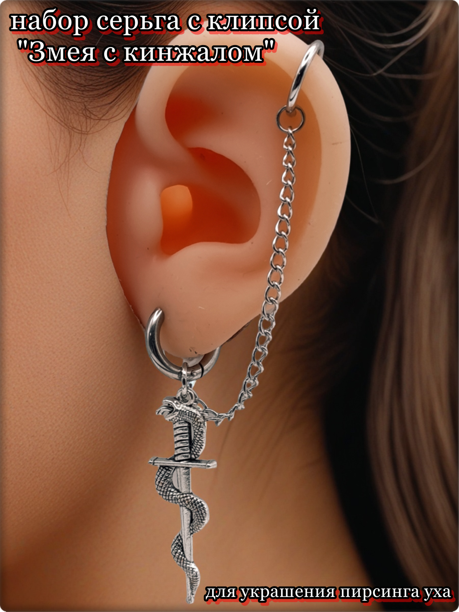 Набор серьга с клипсой "Змея с кинжалом" .
