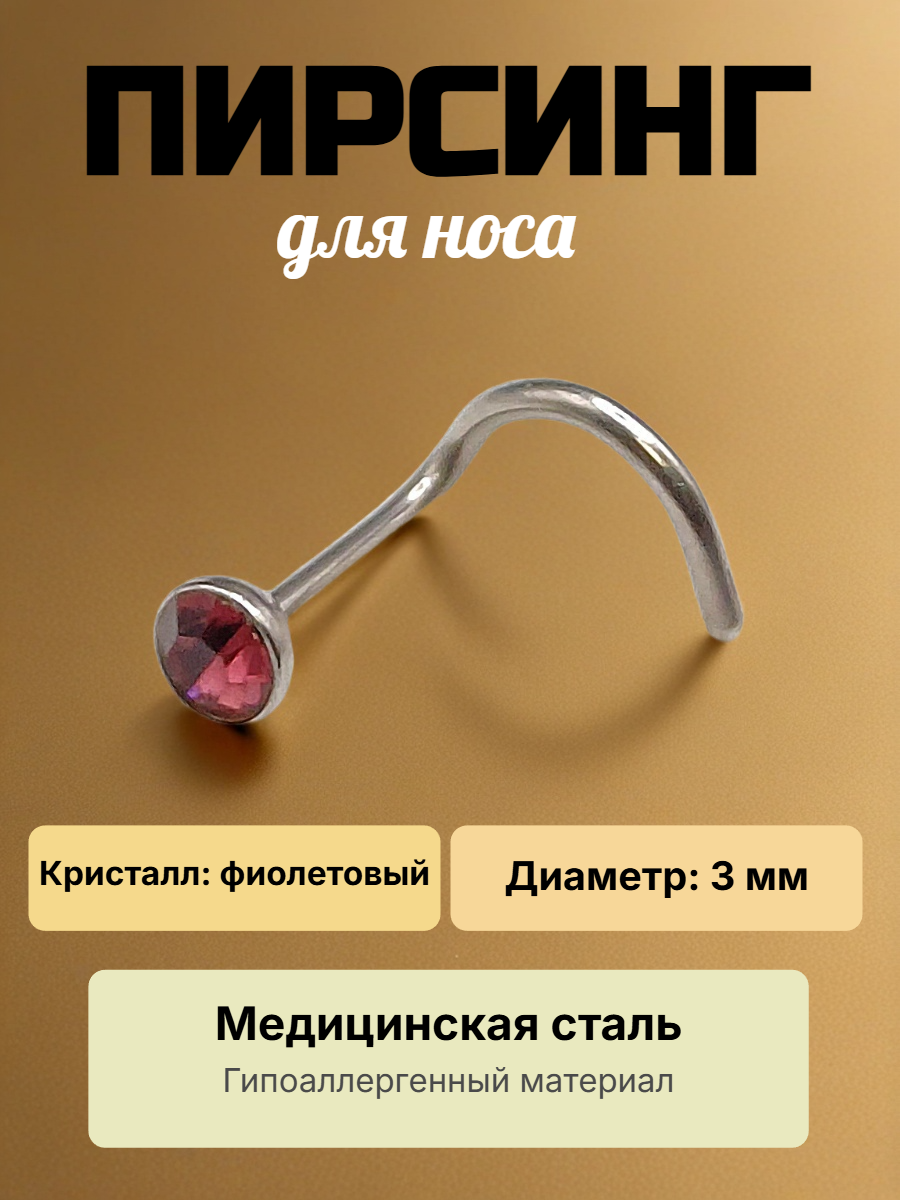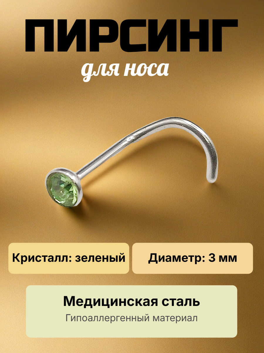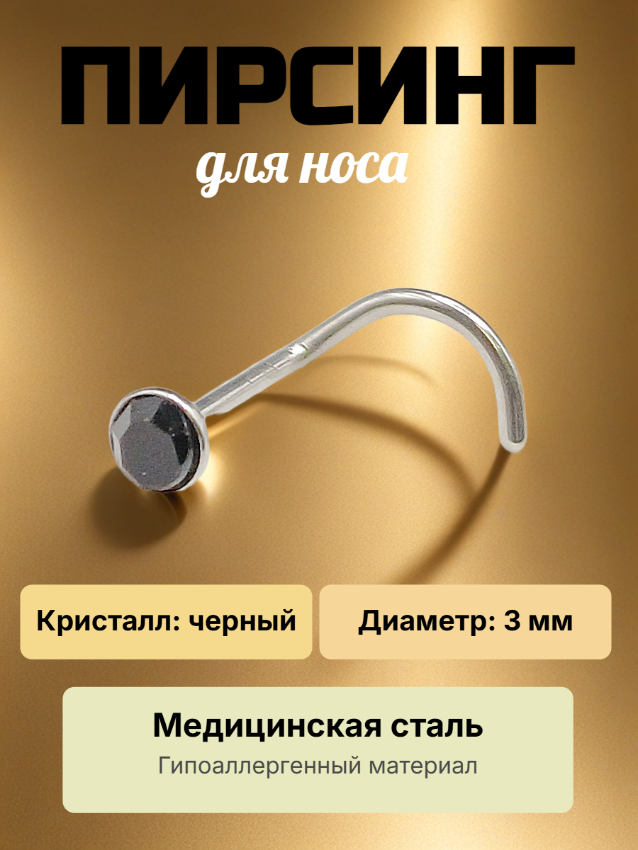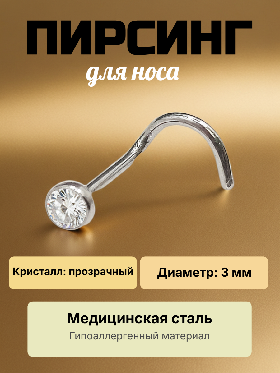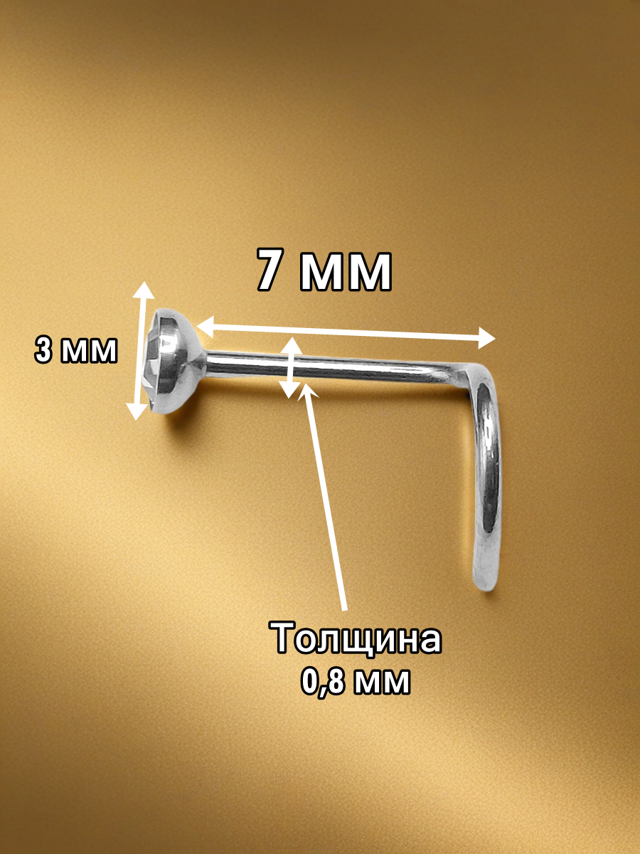 Изогнутая нострила с кристаллом для пирсинга крыла носа Стандартная нострилла для крыла носа, выполненный из хирургической стали, с камешком. Диаметр кристалла - 3 мм, Длина нострилы до изгиба - 7мм. Толщина - 0,8 мм Преимущество изогнутой нострилы в том, что она не выпадает из области пирсинга.