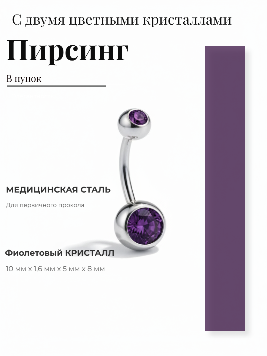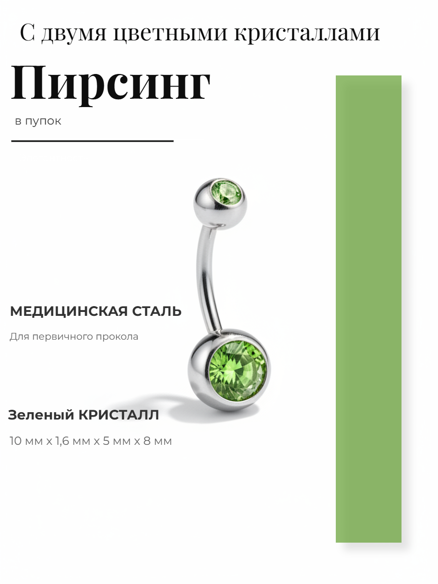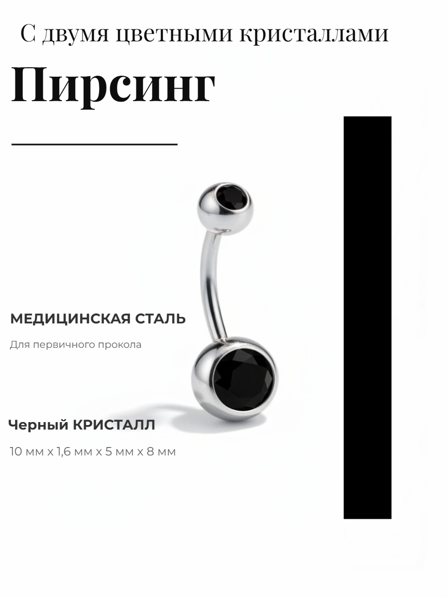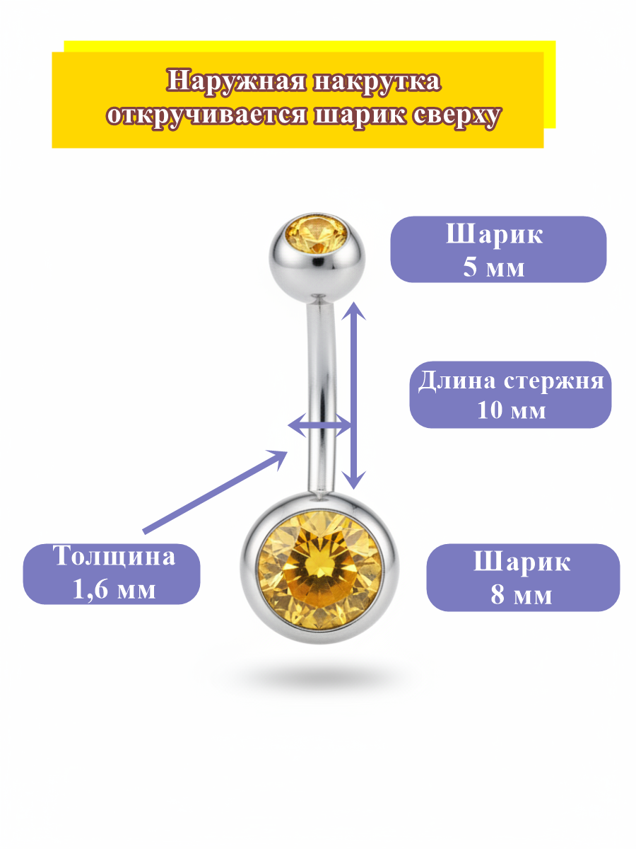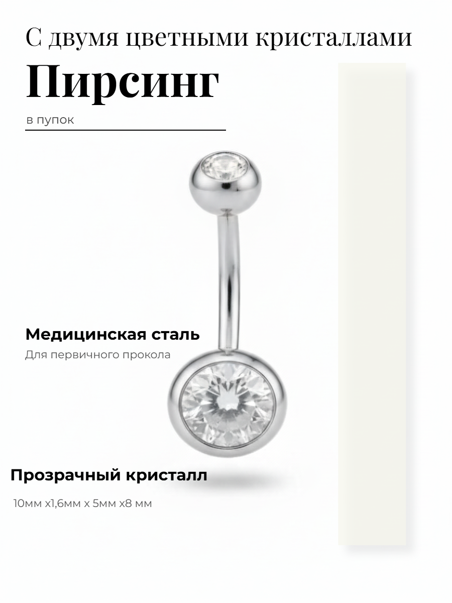 Для прокола пупка с двумя кристаллами из медицинской стали Назначение: для украшения пирсинга пупка (идеально подходит для первичного прокола). Материал: медицинская сталь. Длина банана 10 мм. Толщина 1,6 мм. Диаметр шариков 5 мм, 8 мм.