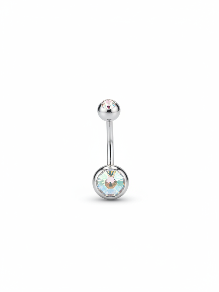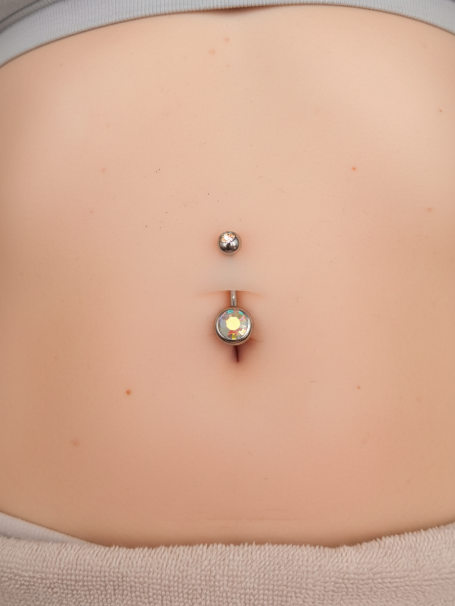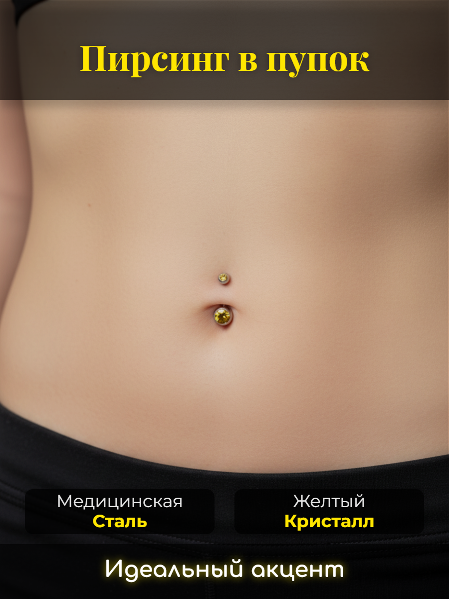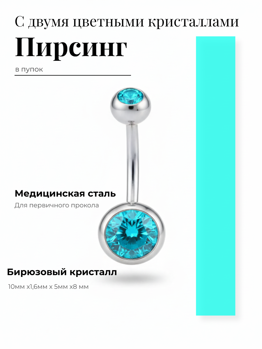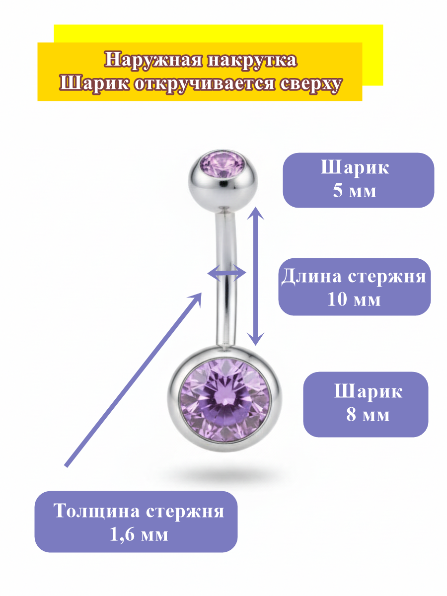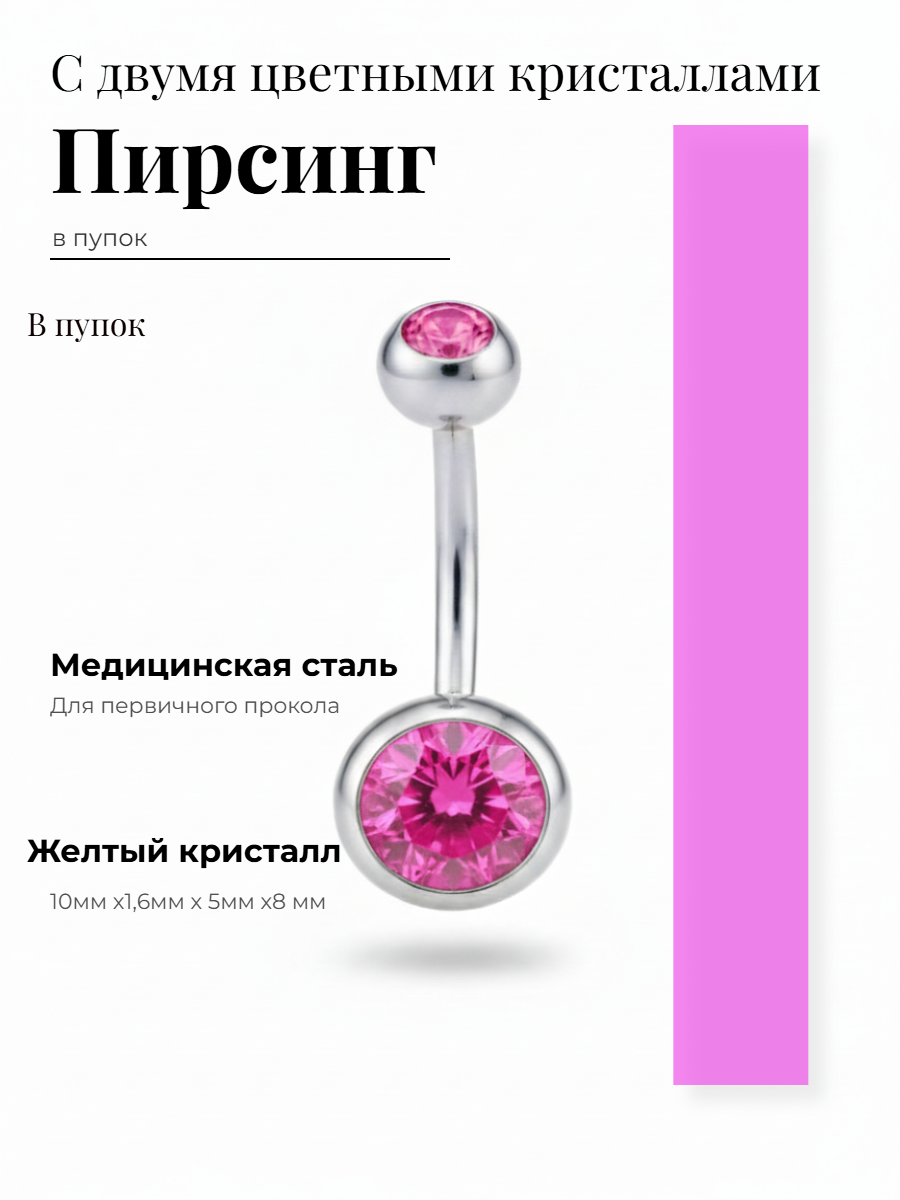 Для прокола пупка с двумя кристаллами из медицинской стали Назначение: для украшения пирсинга пупка (идеально подходит для первичного прокола). Материал: медицинская сталь. Длина банана 10 мм. Толщина 1,6 мм. Диаметр шариков 5 мм, 8 мм.