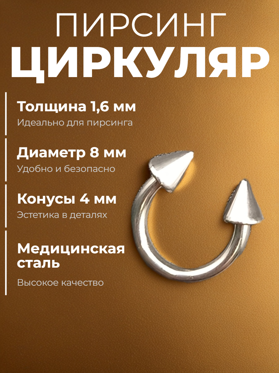 Подковы, полукольца для пирсинга: диаметр 8 мм, толщина 1,6 мм, диаметр конусов 4 мм. Медицинская сталь