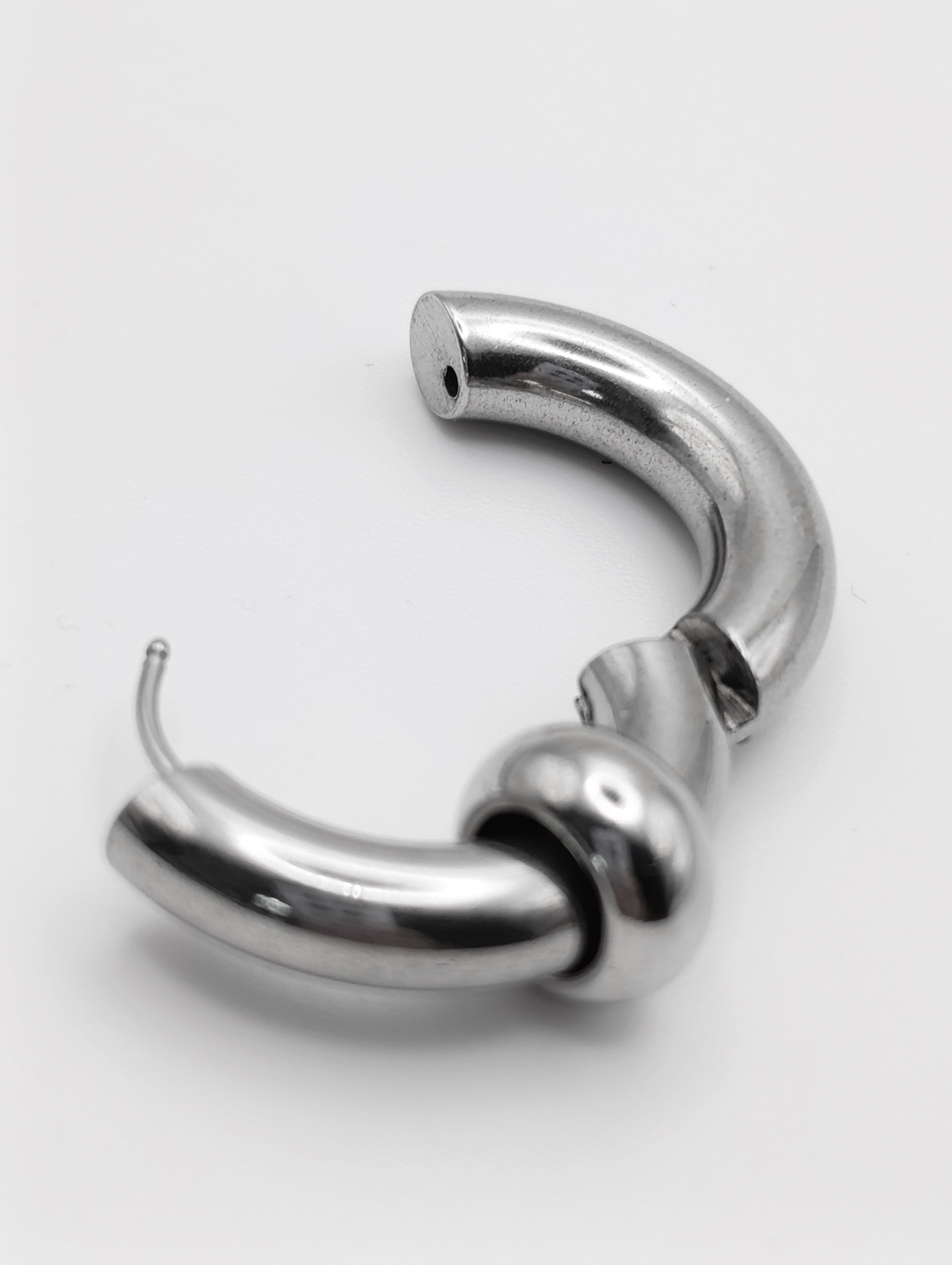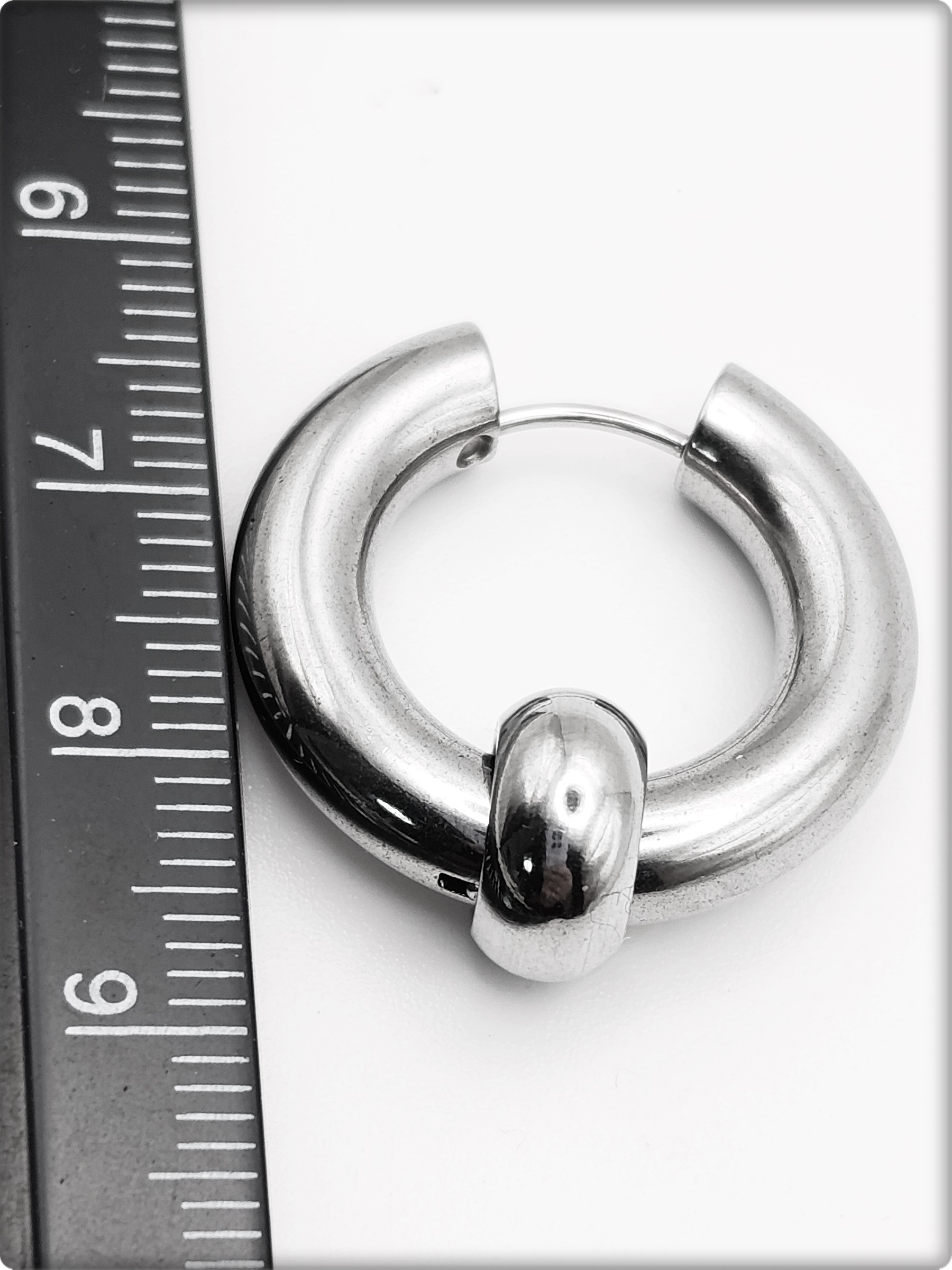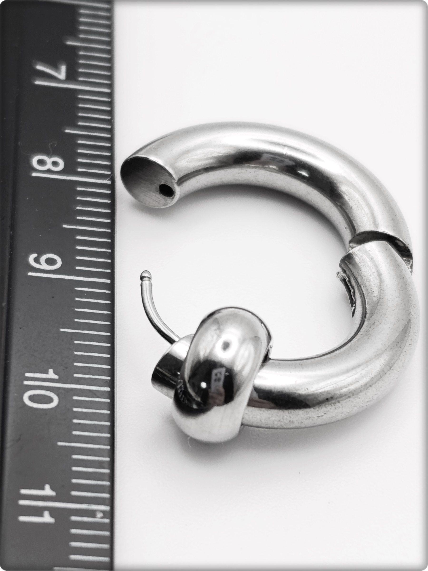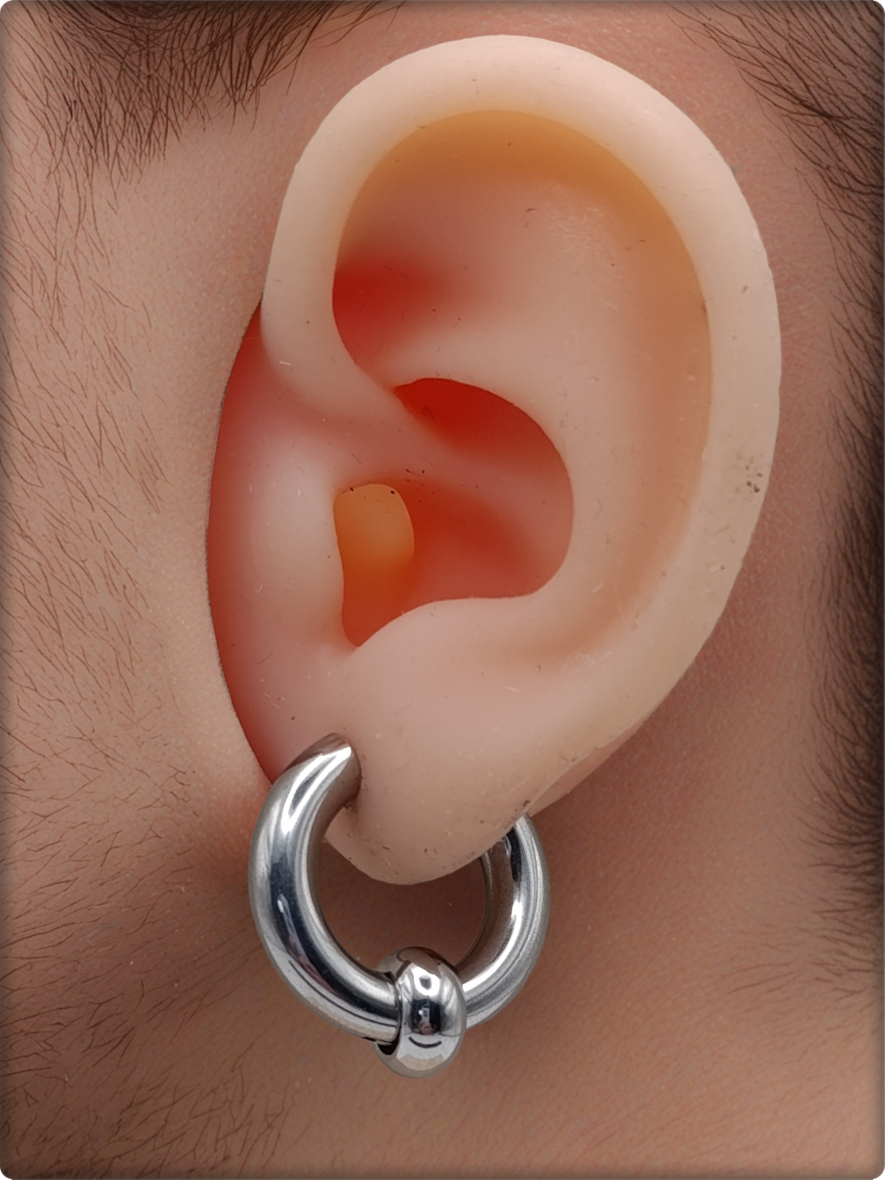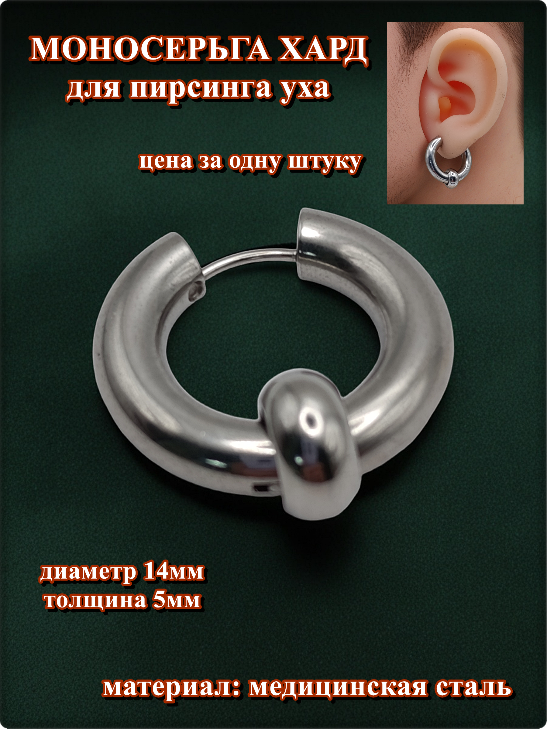 Серьга кольцо имитация харда для украшения пирсинга уха (стандартный прокол). Материал: медицинская сталь. Диаметр кольца наружный 24мм, внутренний 14мм. Толщина серьги 5мм, толщина дужки 1.2мм. Украшение - стальная бусина 10х5мм.