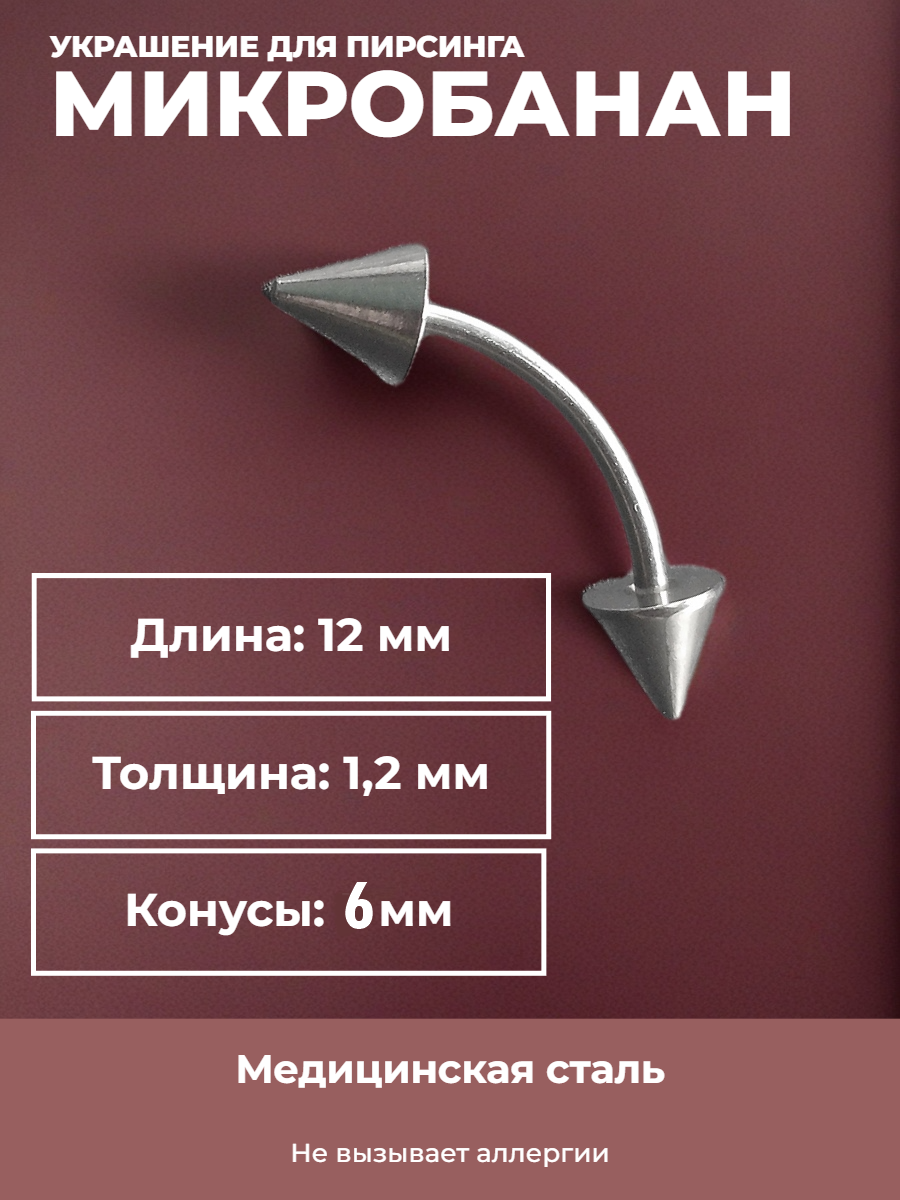 Серьга для прокола брови с шариками. Микробанан из хирургической стали с двумя шариками. Длина банана 12 мм. Толщина 1,2 мм. Диаметр конусов 6 мм. Отлично подходит для украшения пирсинга брови.