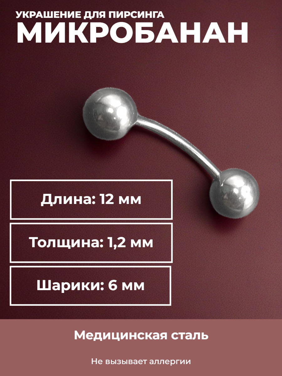 Серьга для прокола брови с шариками. Микробанан из хирургической стали с двумя шариками. Длина банана 12 мм. Толщина 1,2 мм. Диаметр шариков 6 мм. Отлично подходит для украшения пирсинга брови.