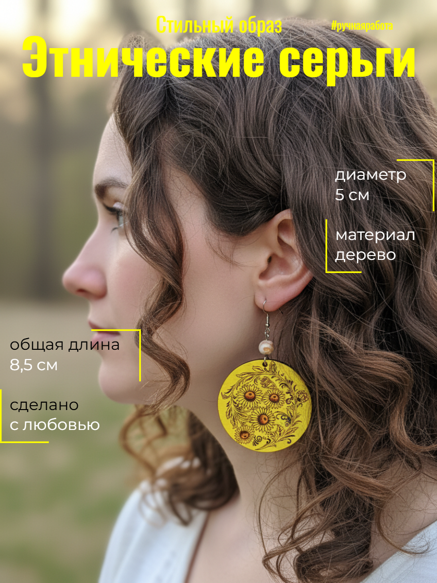 Эти уникальные серьги станут изысканным акцентом вашего образа! Изделия из дерева – это модно, экологично и оригинально. Большой диаметр 5 см делает их особенно заметными и эффектными. Подходят для ежедневного ношения или праздничных мероприятий. От бренда УТМ – стиль, качество и внимание к деталям.