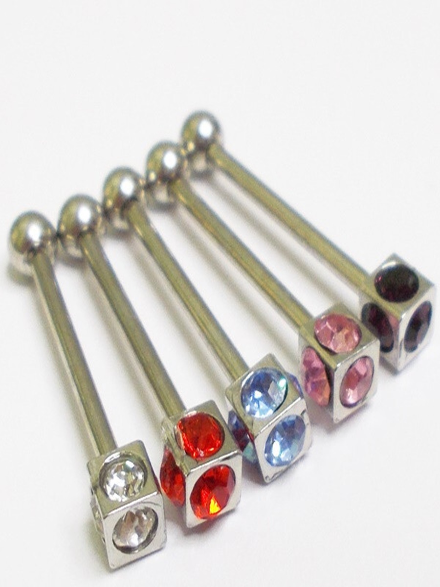 Штанга 18мм для пирсинг языка, толщиной 1,6мм с шариком 4мм и кубом с цветными кристаллами.