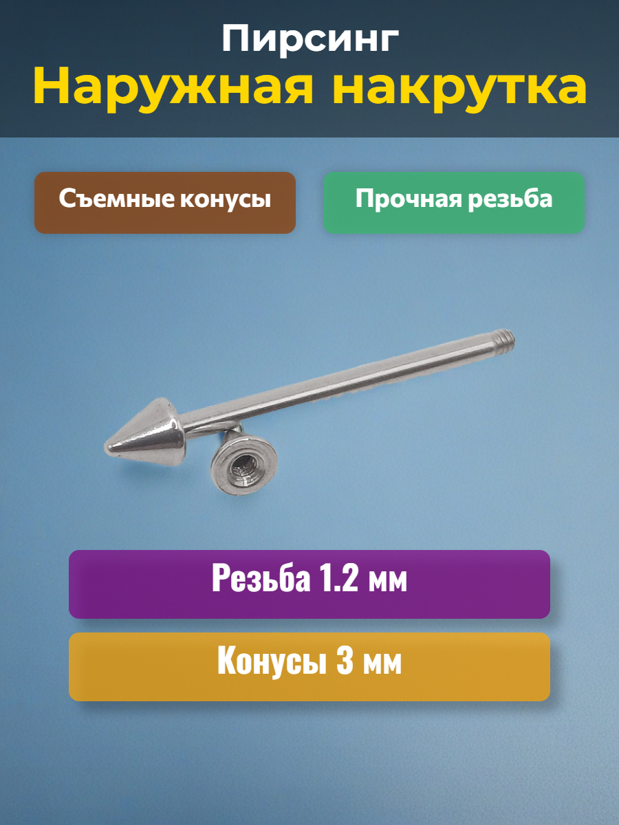 Длина штанги 16 мм, толщина 1,2 мм. Диаметр конусов 3 мм.