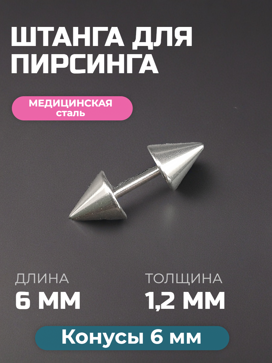 Длина штанги 6 мм, толщина 1,2 мм. Диаметр конусов 6 мм.
