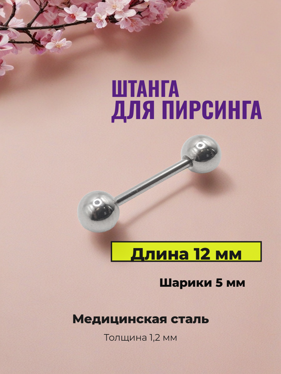 Серьги для пирсинга с шариками 12х1,2х5 мм. Медицинская сталь Серьга для прокола из медицинской стали. Длина штанги 12 мм. Диаметр 1,2 мм. Диаметр шариков 5 мм.