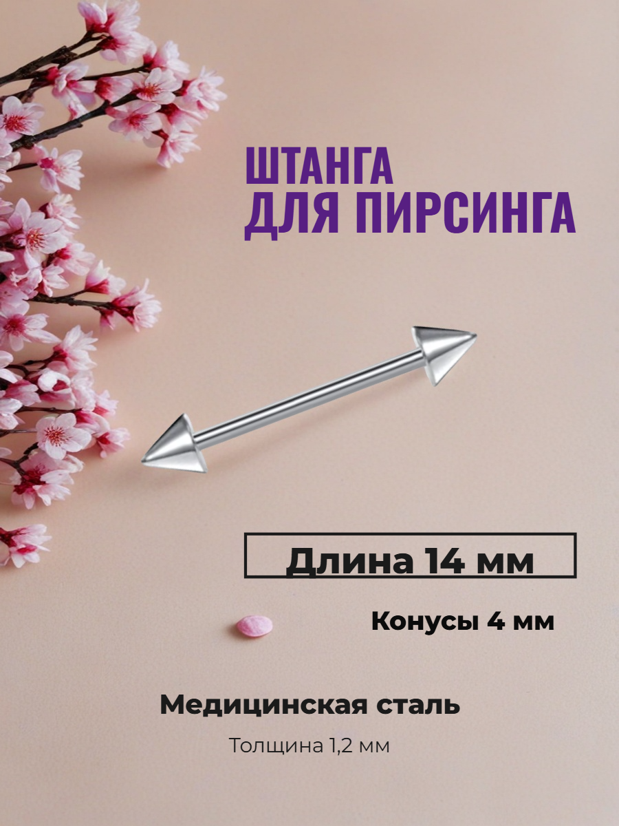 Серьги для пирсинга с конусами 14х1,2х4 мм. Медицинская сталь Серьга для прокола из медицинской стали. Длина штанги 14 мм. Диаметр 1,2 мм. Диаметр конусов 4 мм.