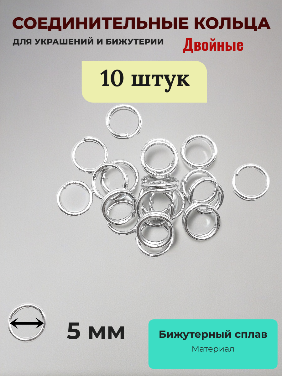 Комплект из 10 штук. Двойные соединительные колечки для бижутерии – идеальный выбор для вашего творчества! Диаметр всего 5 мм позволит гармонично сочетать их с любыми элементами украшений. Надежные двухрядные кольца идеально походят как для профессионального создания и ремонта украшений, так и для хобби и творчества. Служит фурнитурой для карабинов, застежек, основ украшений и заготовок. С помощью двойных колец можно создавать оригинальные и стильные аксессуары для волос, кулоны, броши и браслеты.