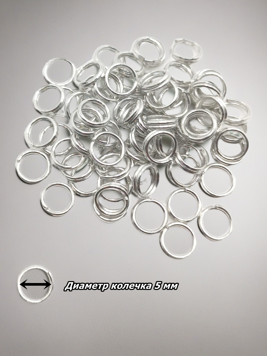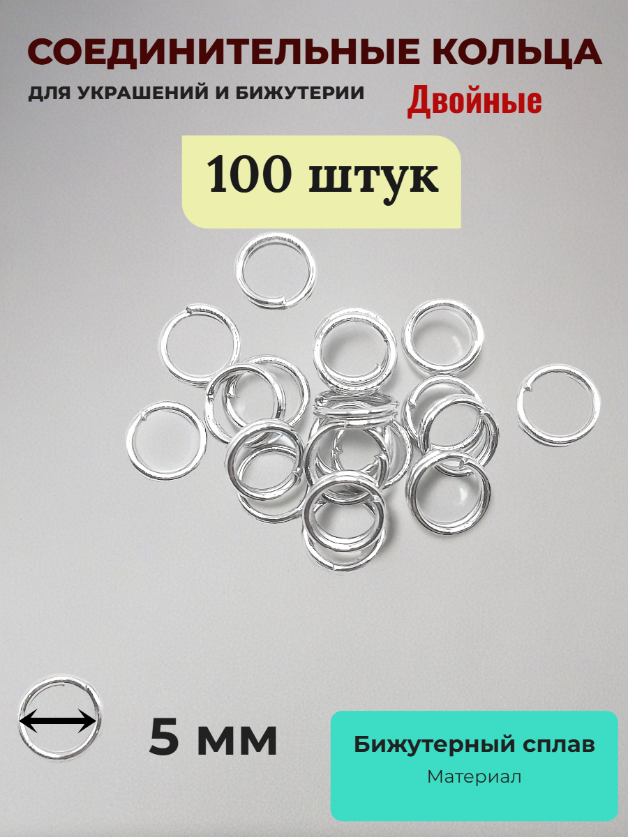 Комплект из 100 штук. Двойные соединительные колечки для бижутерии – идеальный выбор для вашего творчества! Диаметр всего 5 мм позволит гармонично сочетать их с любыми элементами украшений. Надежные двухрядные кольца идеально походят как для профессионального создания и ремонта украшений, так и для хобби и творчества. Служит фурнитурой для карабинов, застежек, основ украшений и заготовок. С помощью двойных колец можно создавать оригинальные и стильные аксессуары для волос, кулоны, броши и браслеты.