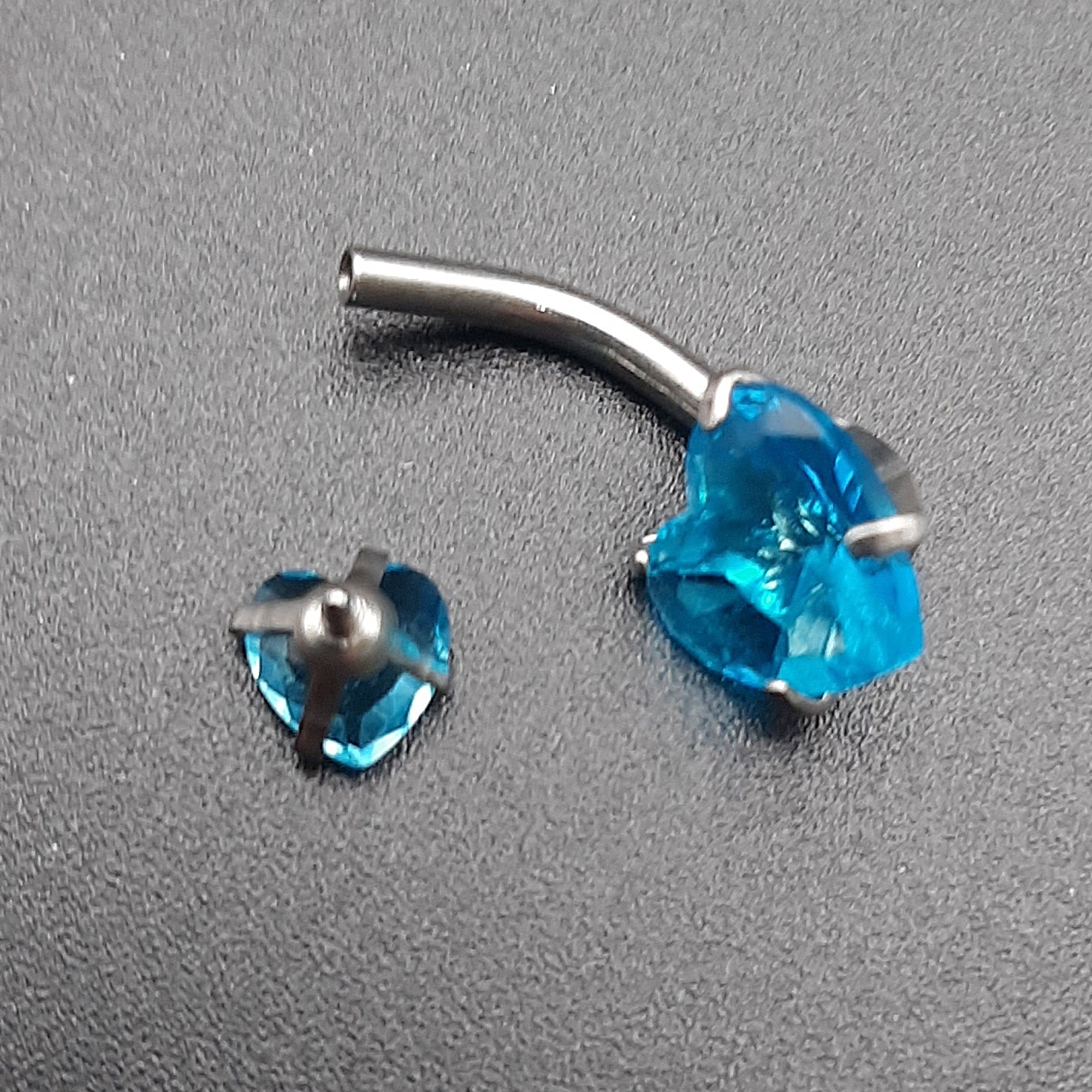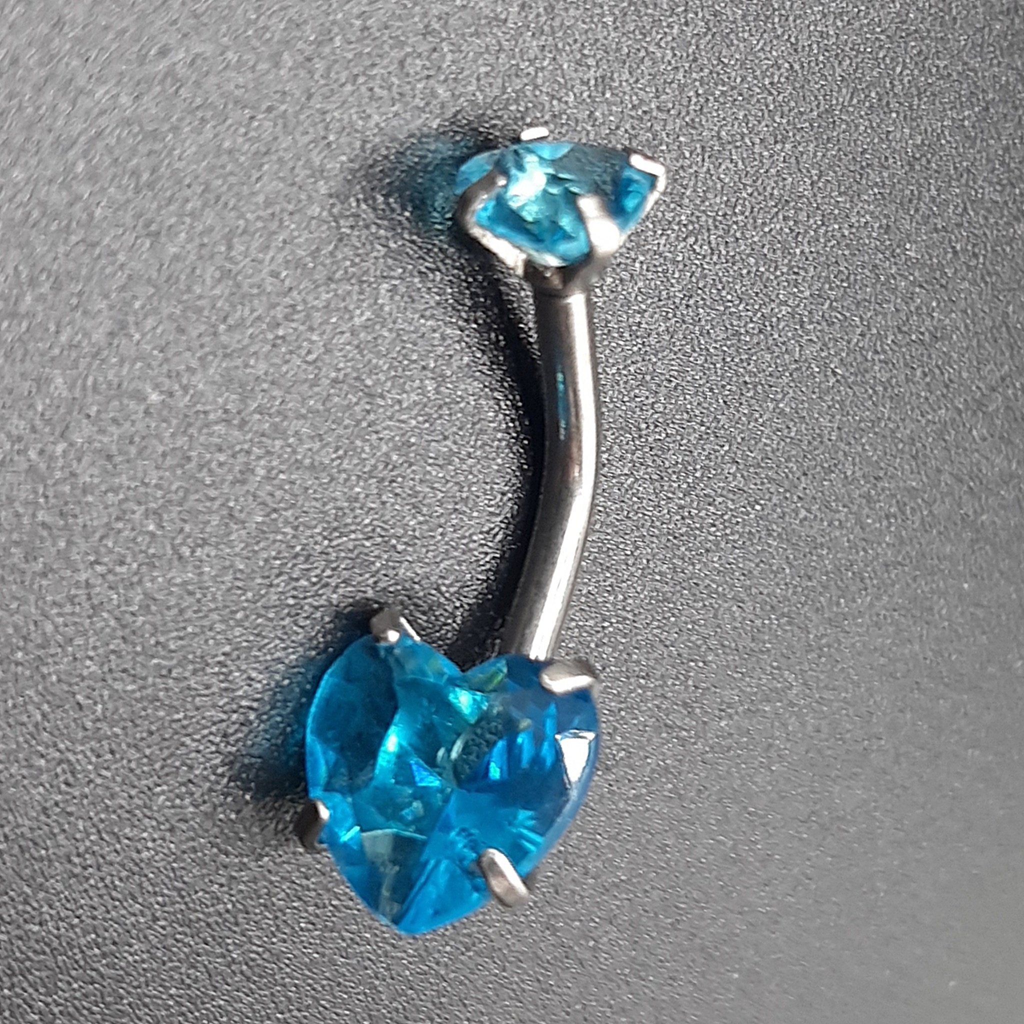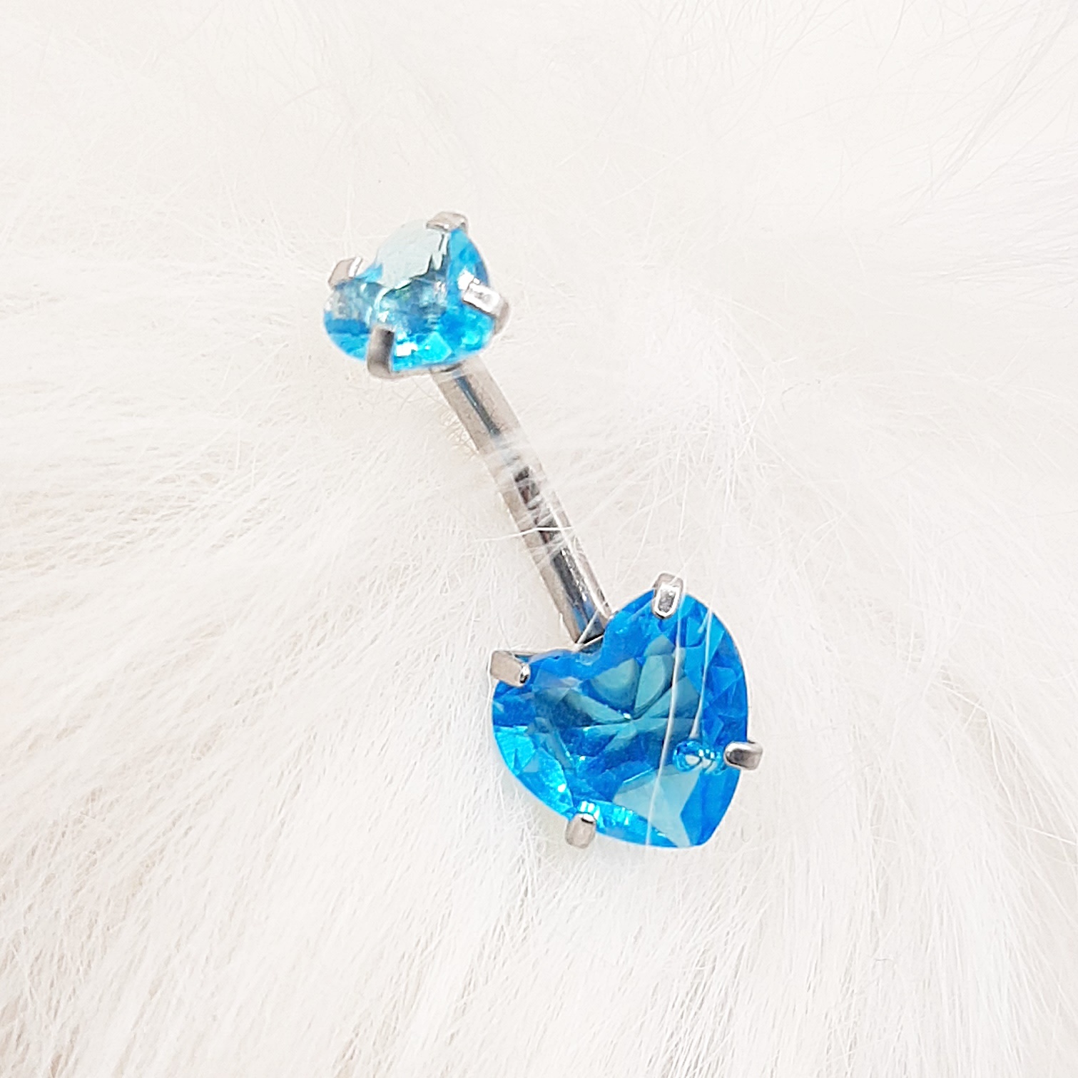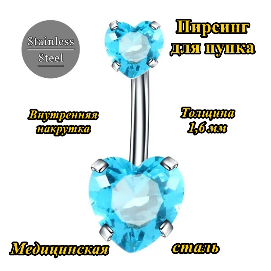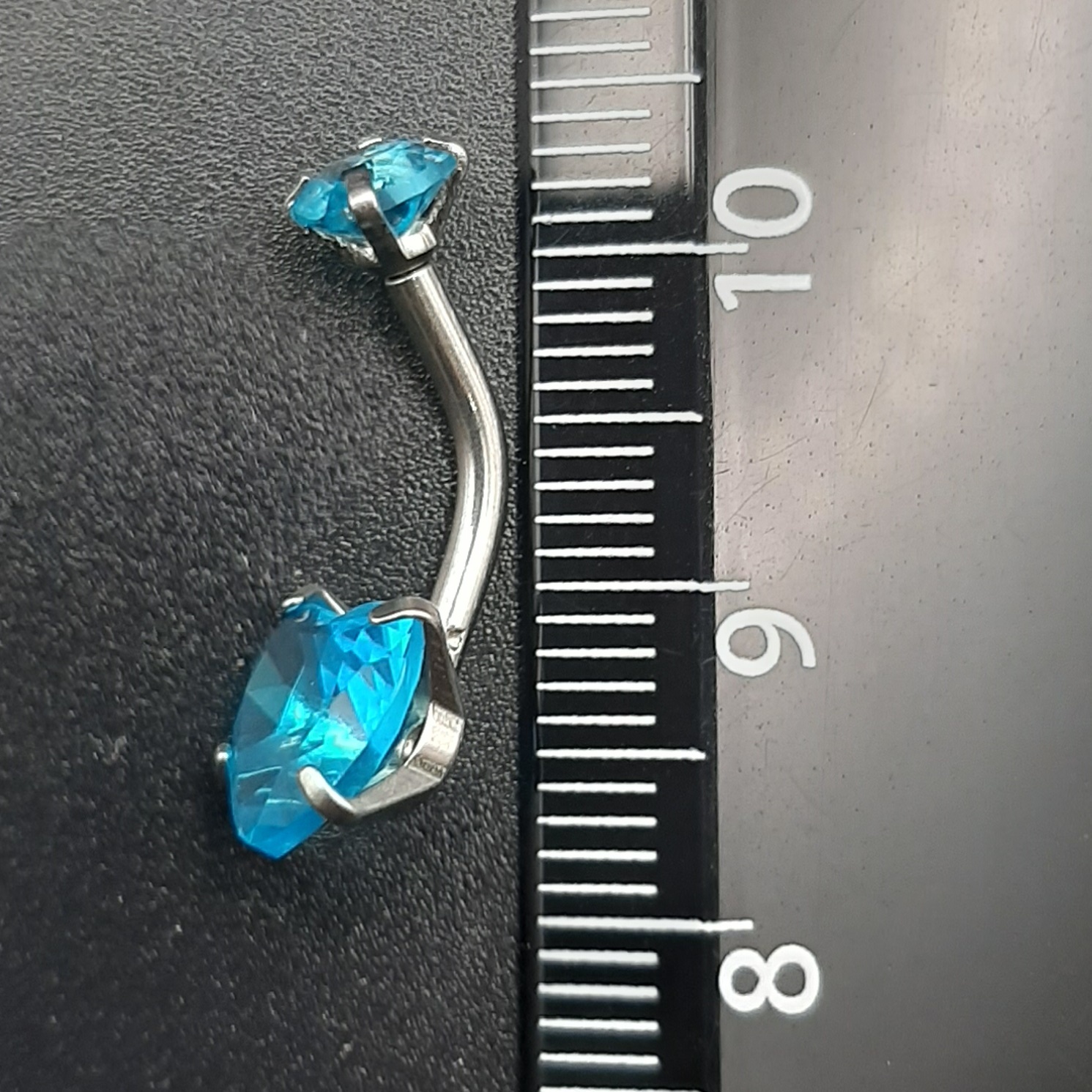Украшение для пирсинга пупка "Два сердца" с голубыми кристаллами . Медицинская сталь