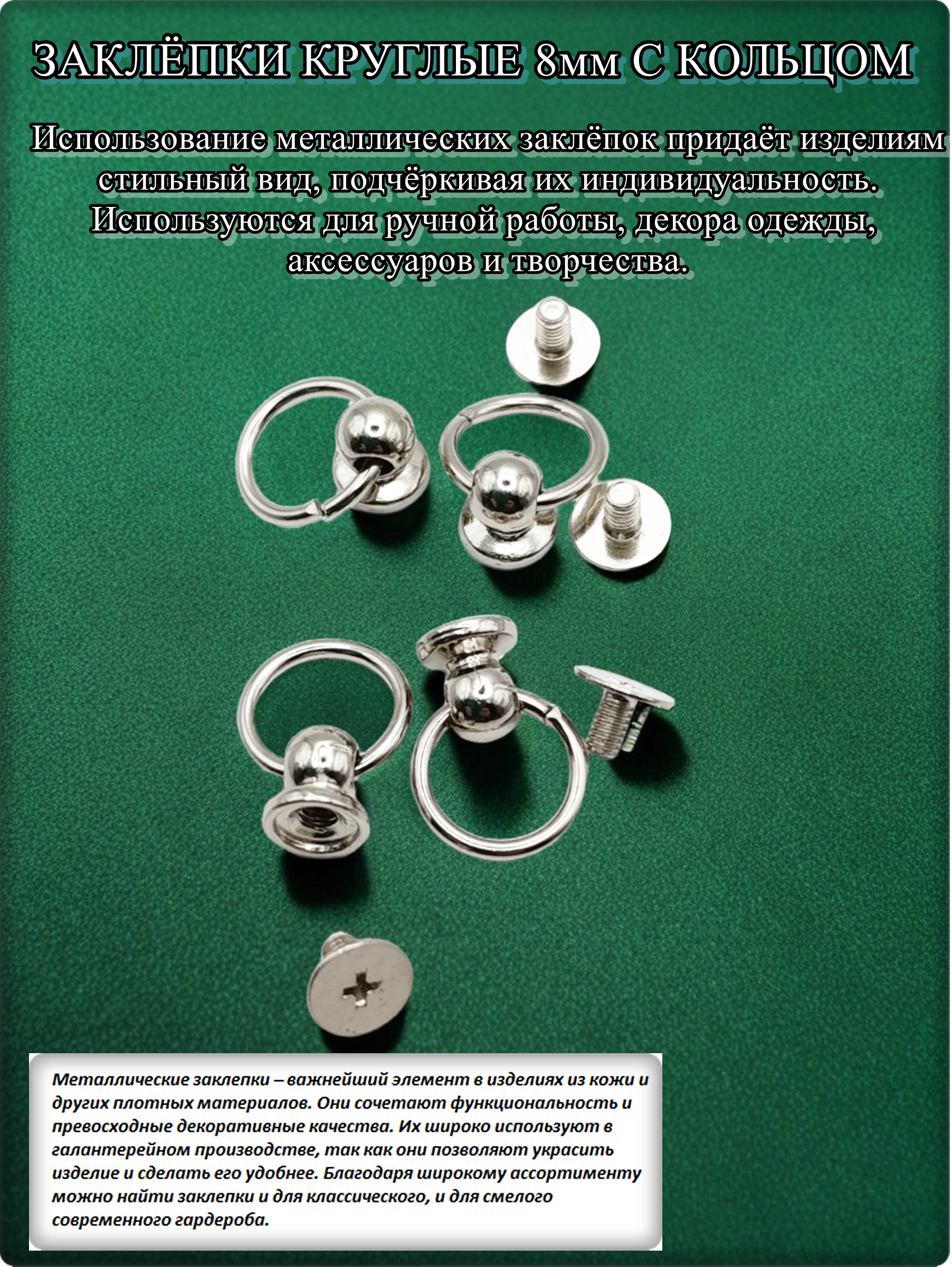 Эти заклёпки от бренда Djeam идеально подходят для украшения изделий из кожи, тканей и прочих материалов. Использование металлических заклёпок придаёт изделиям стильный вид подчёркивая их индивидуальность и качество. Используются для ручной работы, декора одежды, аксессуаров и творчества. Компактны, просты в применении, обеспечивают надёжное соединение. Подходит для стиля кэжуал, гранж, панк и повседневного образа.