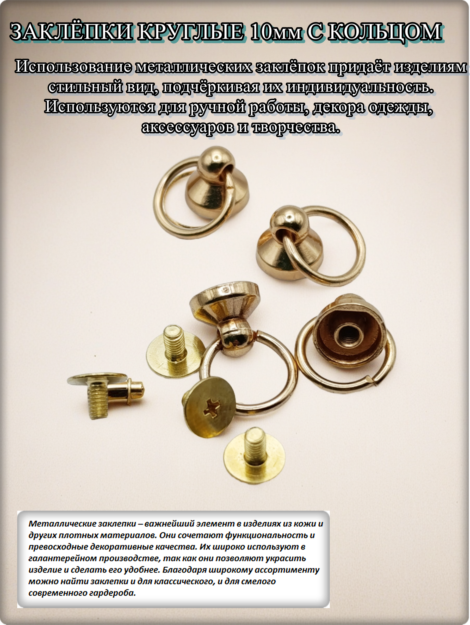 Эти заклёпки от бренда Djeam идеально подходят для украшения изделий из кожи, тканей и прочих материалов. Использование металлических заклёпок придаёт изделиям стильный вид подчёркивая их индивидуальность и качество. Используются для ручной работы, декора одежды, аксессуаров и творчества. Компактны, просты в применении, обеспечивают надёжное соединение. Подходит для стиля кэжуал, гранж, панк и повседневного образа.